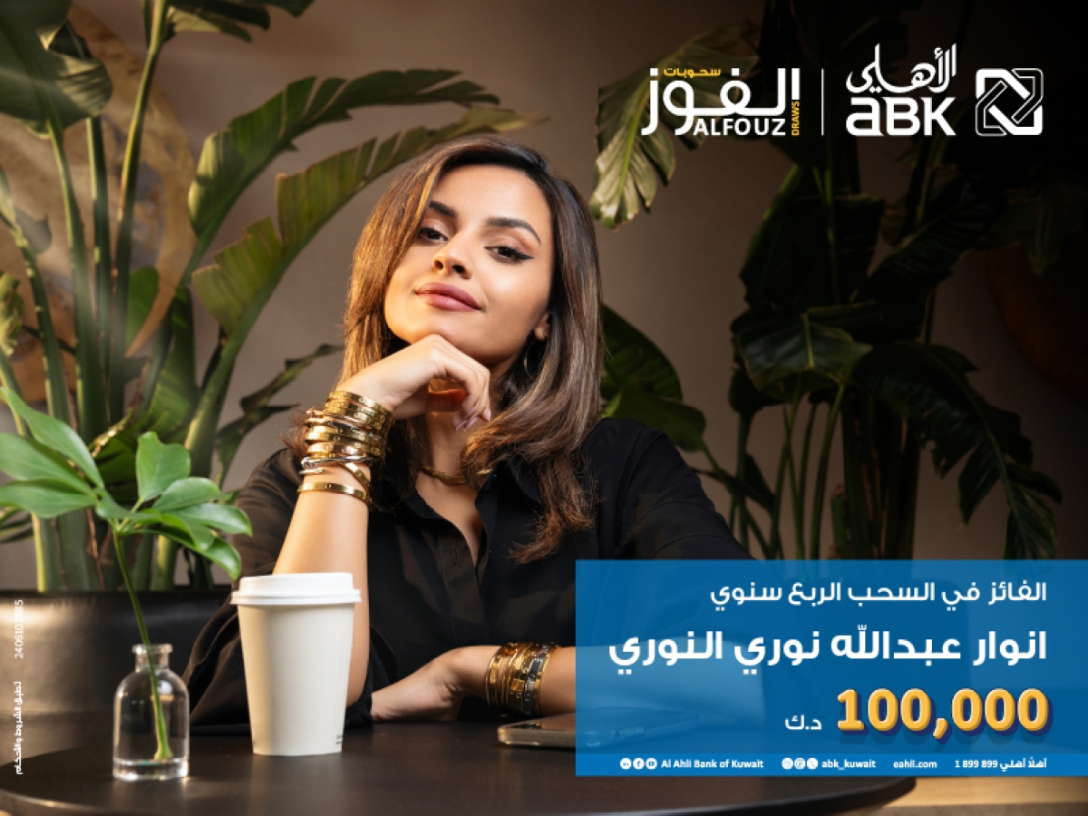 أعلن البنك الأهلي الكويتي فوز أنوار عبدالله نوري النوري بجائزة 100 ألف دينار، في السحب ربع السنوي لحساب الفوز الذي أجراه الاثنين الماضي بحضور ممثل وزارة التجارة والصناعة، لضمان أعلى قدر من الشفافية على النتائج.