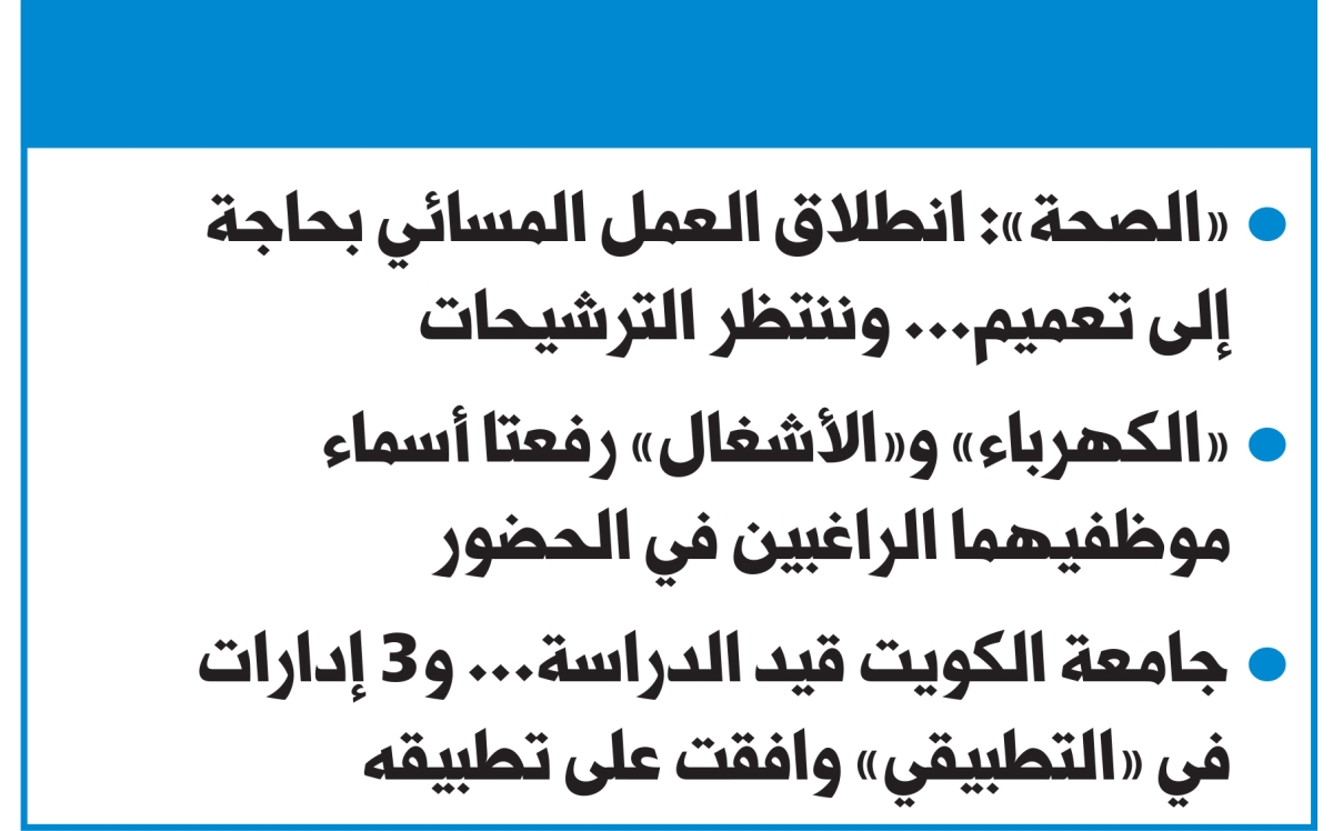 وأكدت المصادر لـ «الجريدة» أن القطاعات المعنية في وزارة الصحة، وعلى رأسها قطاع الشؤون الإدارية، خاطب مختلف الإدارات في الوزارة عن مدى حاجتهم للعمل المسائي، وفي انتظار الترشيح من قبلهم، لافتة إلى أن انطلاق العمل المسائي لموظفي الصحة بحاجة إلى تعميم.