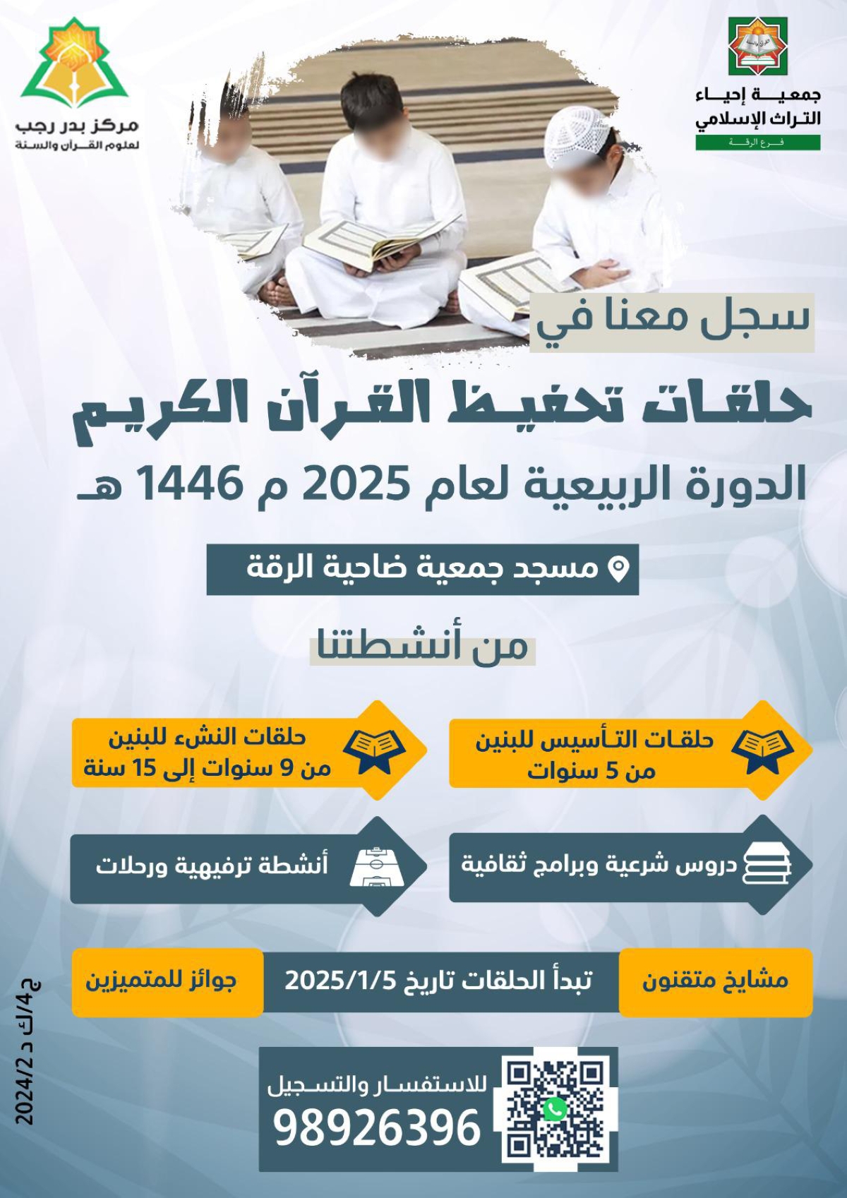 تنظم جمعية إحياء التراث الإسلامي العديد من الدورات الربيعية للأبناء، والتي تهتم بتعليمهم أساسيات القراءة والكتابة وتلاوة القرآن بشكل متقن، ومن ذلك دورة لحفظ القرآن الكريم في مسجد ضاحية الرقة.
