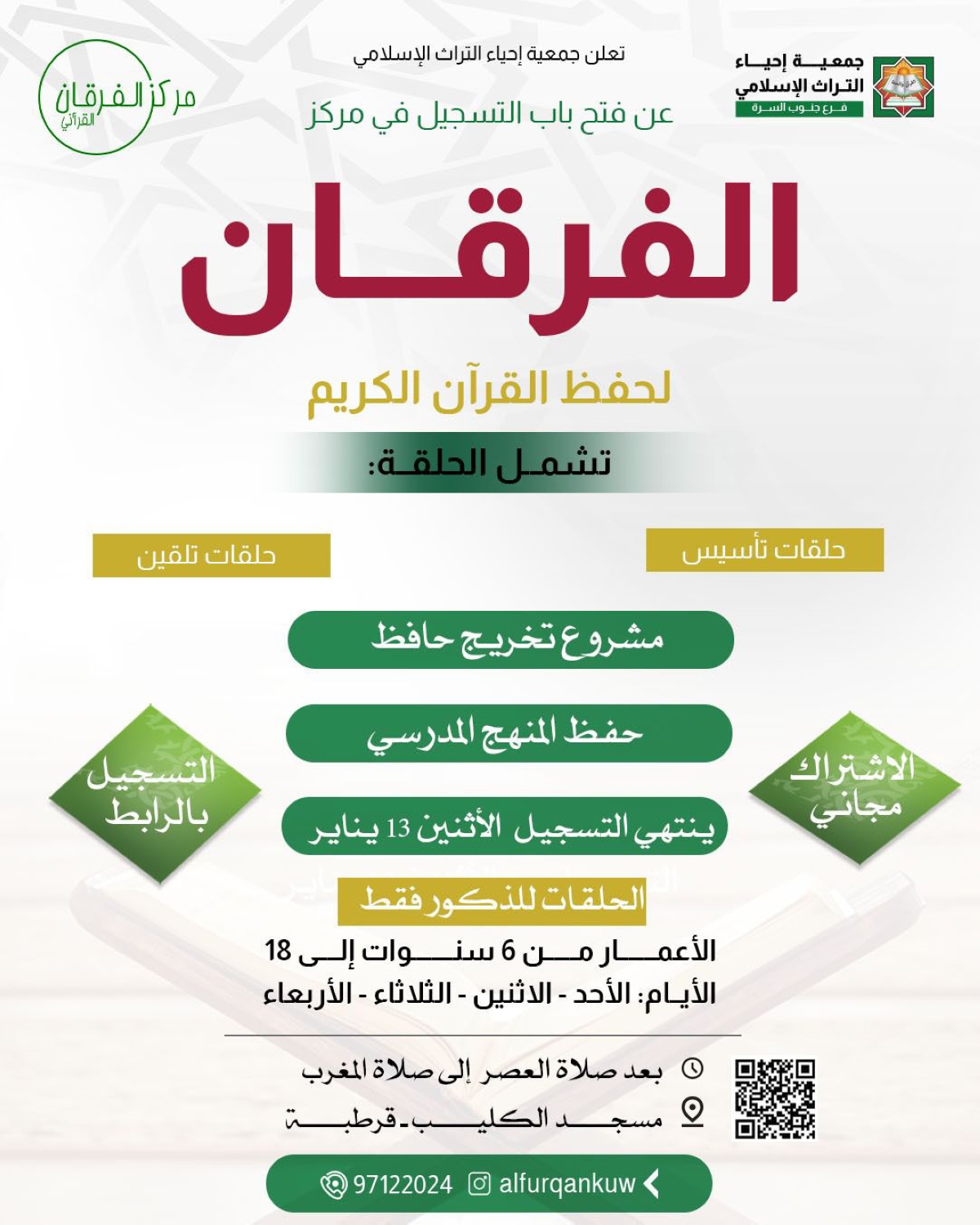 وذكرت الجمعية، في بيان، أن مركز الفرقان القرآني التابع لها بمنطقة جنوب السرة، ينظم حلقة «الفرقان لحفظ القرآن الكريم» للذكور ممن تتراوح أعمارهم من 6 - 18 سنة، موضحة أن برنامج الحلقة يشمل: مشروع تخريج حافظ، وحلقات تأسيس، وحلقات تلقين، وحفظ المنهج المدرسي.