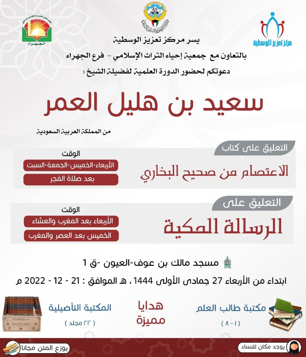 تقيم جمعية إحياء التراث الإسلامي، بالتعاون مع مركز تعزيز الوسطية، دورة علمية للشيخ سعيد العمر من السعودية، ابتداء من اليوم.