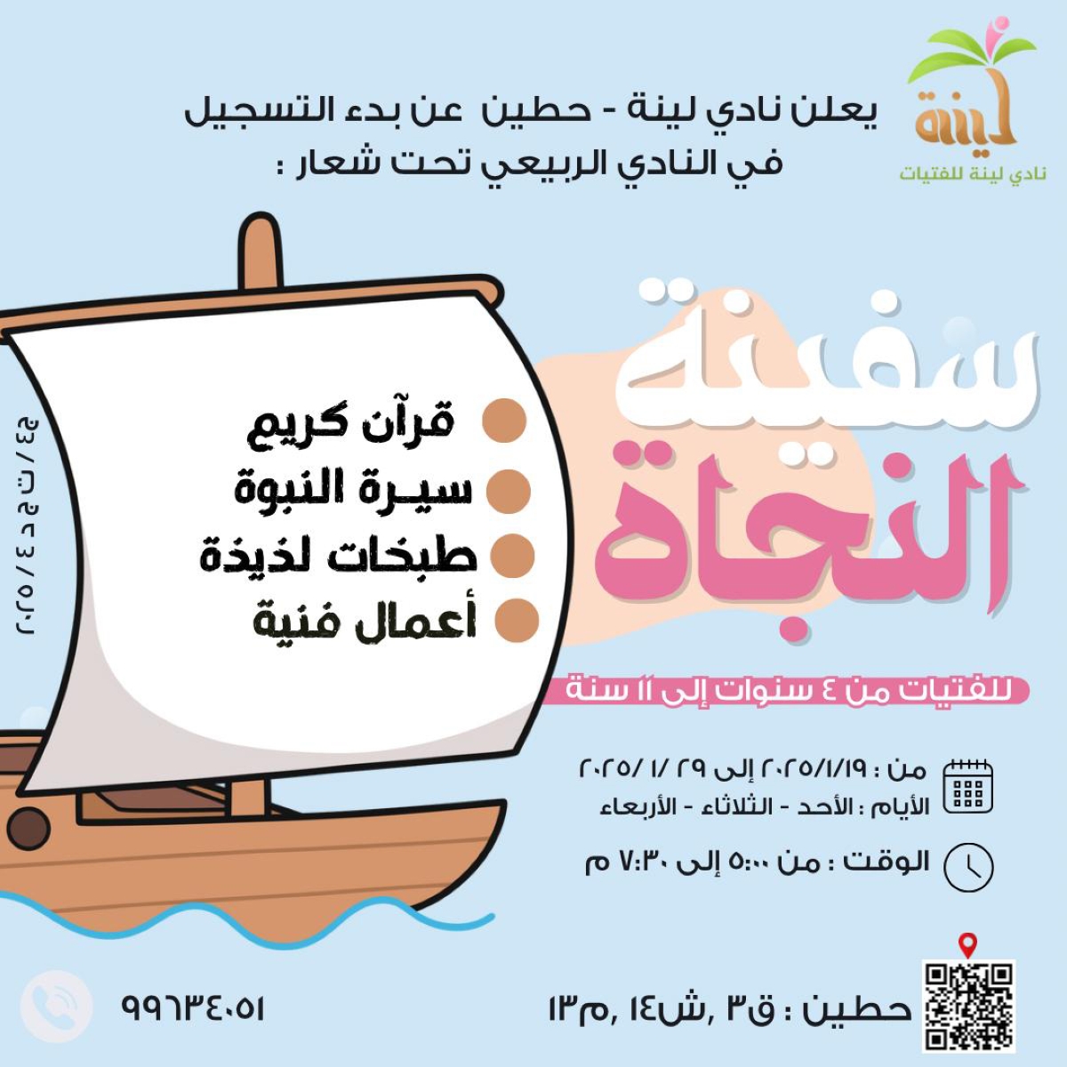 تنظم جمعية إحياء التراث الإسلامي، دورة ربيعية بعنوان «سفينة النجاة» يشرف عليها نادي لينة للفتيات في منطقة حطين، وهي مخصصة للفتيات من سن (4 - 11) سنة لتنمية المهارات التعبيرية والعقلية للطفل، والاعتماد على النفس.