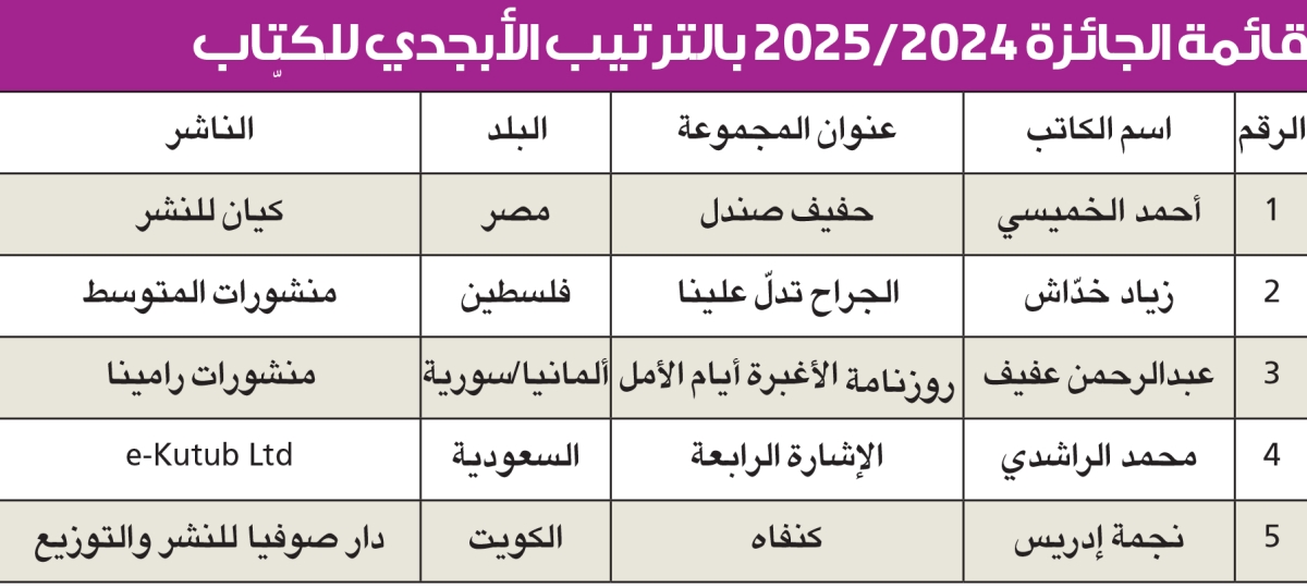 وعقدت اللجنة اجتماعات ونقاشات مستفيضة ومداولات متعددة، امتدت طوال الأشهر الماضية، للوصول إلى أهم المجاميع القصصيّة في هذه الدورة، وكانت إدارة الجائزة أعلنت القائمة الطويلة المكوّنة من 10 مجاميع قصصية في منتصف الشهر الماضي. وخلال الفترة المنقضية انكبت اللجنة على تمحيص المجاميع القصصية للوصول إلى القائمة القصيرة التي تستحق بجدارة أن تقدّم مشهدًا إبداعيًا قصصيًا عربيًا دالّاً على أهمية فن القصة القصيرة العربية، ومعالجته لأهم القضايا التي تهم المواطن العربي، ضمن فضاء إبداعي أدبي عالمي. وتوصّلت لجنة التحكيم لاختيار القائمة القصيرة للدورة السابعة 2025/2024 ممثلة بـ 5 دول عربية وأجنبية، وبوجود كاتبة عربية بين أربعة كتّاب، وجاءت القائمة القصيرة وفق الجدول التالي: