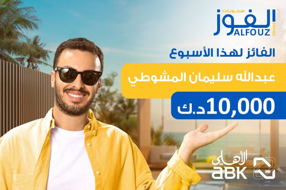 أعلن البنك الأهلي الكويتي فوز عبدالله سليمان المشوطي في السحب الأسبوعي لحساب «الفوز» للجوائز، بجائزة نقدية قدرها 10000 دينار، والذي أقيم تحت إشراف وزارة التجارة والصناعة، وتم الإعلان عن اسم الفائز الاثنين 19 ديسمبر 2022.