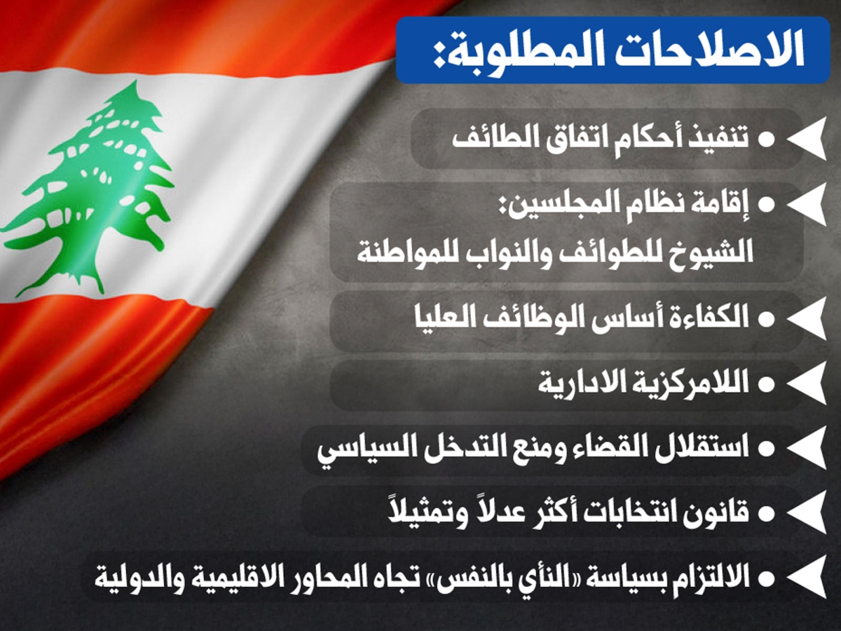 ونقطة الانطلاق إلى ذلك الأمل هي الإصلاحات التي يدعو إليها، من خلال العمل، وفي آن واحد تنفيذ أحكام الطائف، التي لم تُنفذ بعد، وتصحيح اختلالاته.