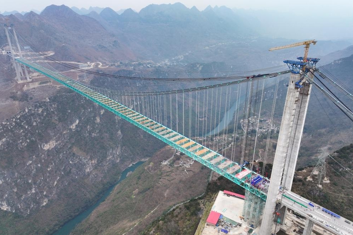 أكملت الصين بناء الهيكل الرئيسي لجسر في مقاطعة قويتشو بجنوب غربي البلاد، والذي يُتوقع أن يكون الجسر الأكثر ارتفاعاً في العالم.