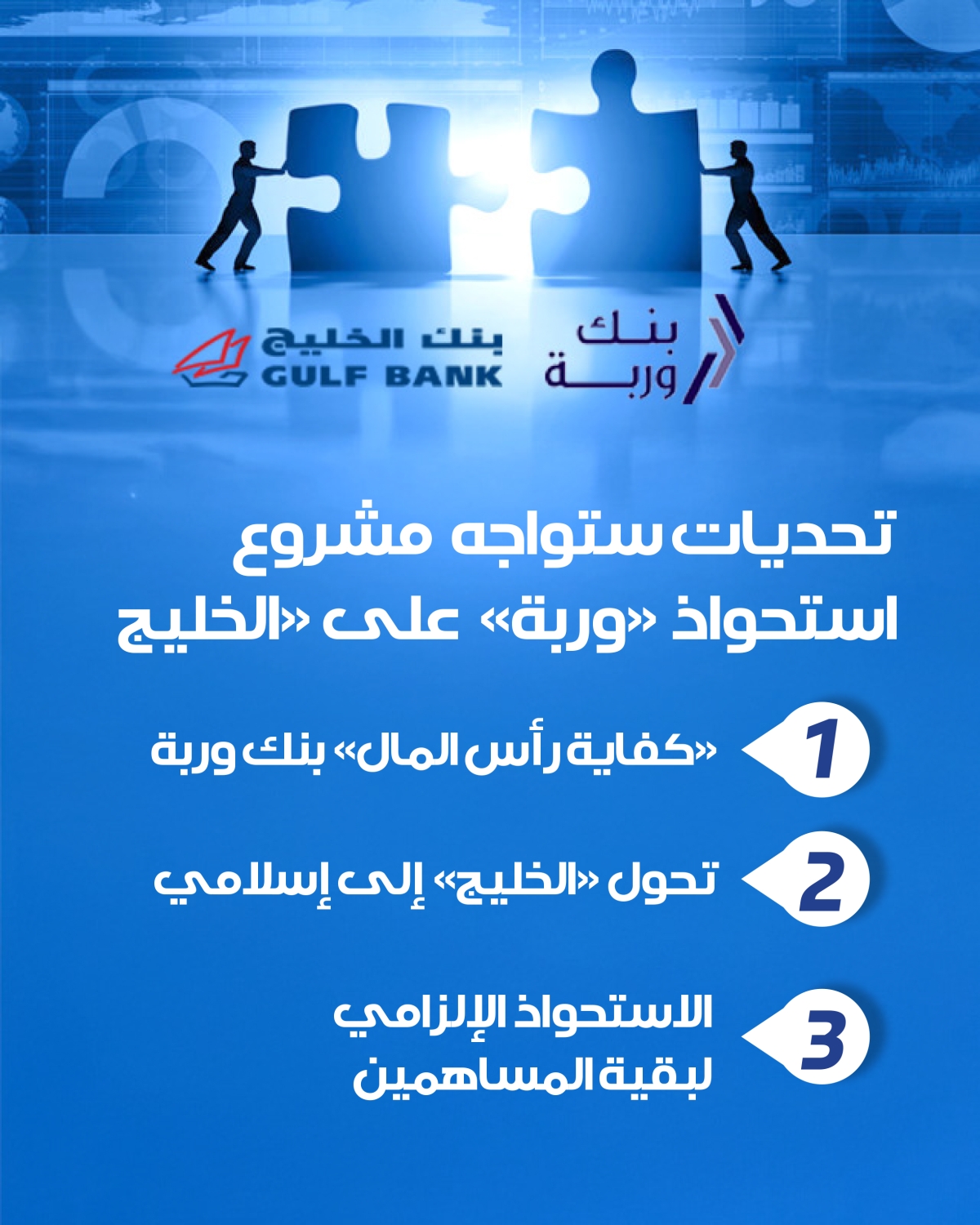 في تفاصيل التقرير، البنكان مشروع الاستحواذ الجديد من بنوك الوسط من أصل 9 بنوك تجارية محلية، يحتل ضمنها بنك الخليج الترتيب الخامس في حجم أصوله وودائعه والرابع في حجم قروضه، ويحتل بنك وربة الترتيب السابع ضمن نفس المكونات الثلاثة في نهاية الربع الثالث 2024.