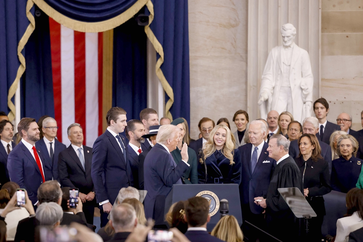 ووسط حضور محدود بسبب تنظيم المراسم تحت قبة «الكابيتول»، (مقر الكونغرس ورمز الديمقراطية الأميركية)، وذلك لتجنب البرد، أدى ترامب، وهو أول رئيس أميركي منذ القرن التاسع عشر يفوز بولاية ثانية بعد خروجه من البيت الأبيض، اليمين الدستورية على كتاب مقدس ورثه عن والدته، لتنطلق بذلك ولاية رئاسية مضطربة لمدة 4 سنوات، تعهّد ترامب بأن يقوم خلالها باللجوء إلى مبدأ السلام عبر القوة والضغط على حلفاء واشنطن قبل خصومها «لجعل أميركا عظيمة مجدداً»، إلى جانب زيادة صلاحيات السلطة التنفيذية وترحيل ملايين المهاجرين.
