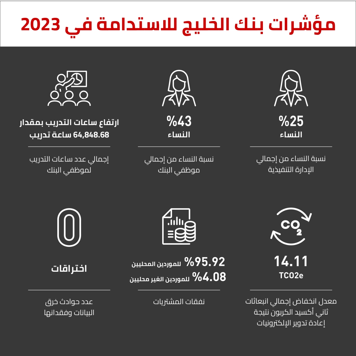يُذكر أن بنك الخليج أصدر تقريره الرابع للاستدامة عن عام 2023، والذي يعكس مدى التقدم الذي حققه البنك في مجالات الاستدامة، حيث يشكّل شهادة سنوية على التزامنا الراسخ بمبادئ الحوكمة البيئية والاجتماعية والمؤسسية، ويسلّط الضوء على الخطوات الجريئة التي قطعناها في خدماتنا وعملياتنا ومبادراتنا المتنوعة في هذا الإطار.