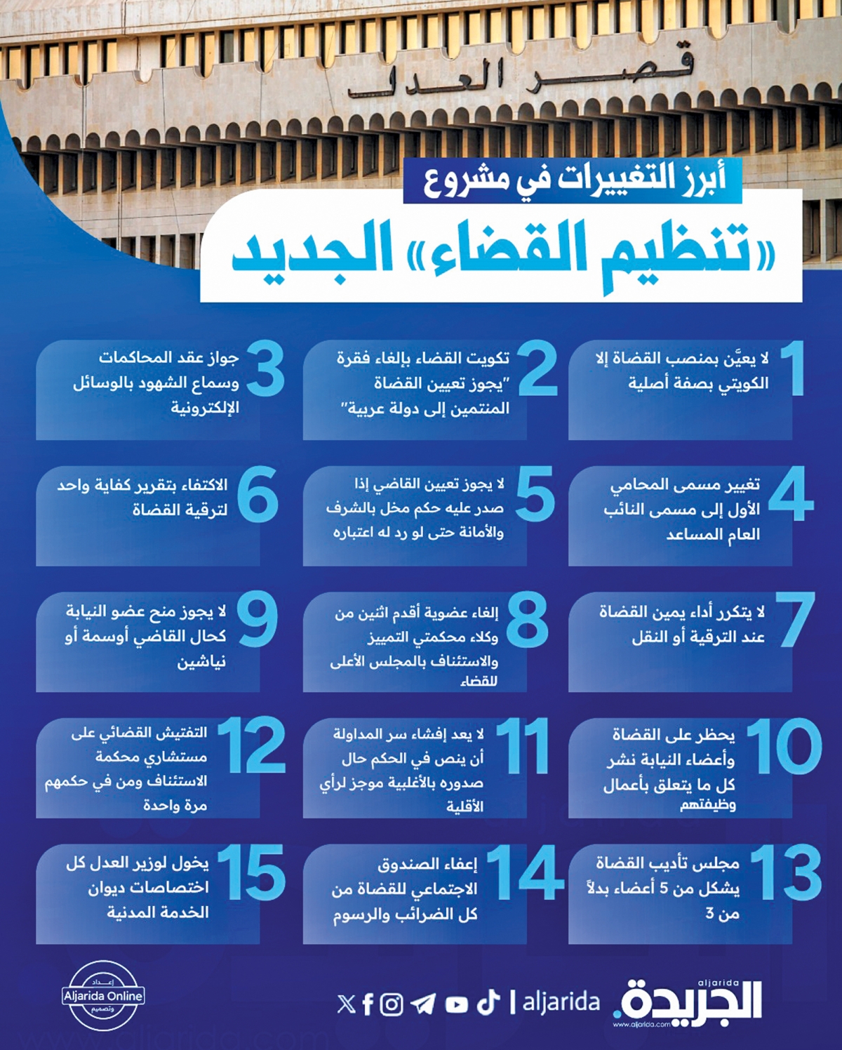 تضمّن مشروع مرسوم بقانون بتعديل بعض أحكام قانون تنظيم القضاء الذي أرسله وزير العدل المستشار ناصر السميط إلى رئيس المجلس الأعلى للقضاء، د. عادل بورسلي، 81 مادة وردت في 7 أبواب.