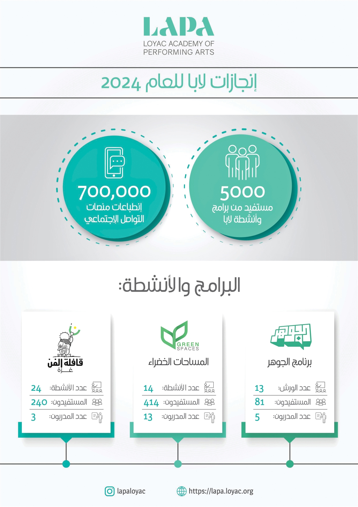 تنوَّعت إنجازات أكاديمية لوياك للفنون الأدائية – «لابا» خلال عام 2024، واتسم معظمها بدعم القضية الفلسطينية، حيث تبنت شعار «لتحيا شجرة الزيتون» في كل فعالياتها وبرامجها، بدءاً من مخيمات «لابا» للأطفال، ومشروع «قافلة الفن - غزة»، وصولاً إلى مهرجان «العودة»، و«لتحيا شجرة الزيتون».