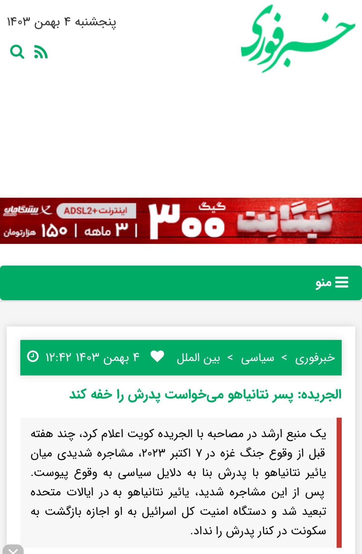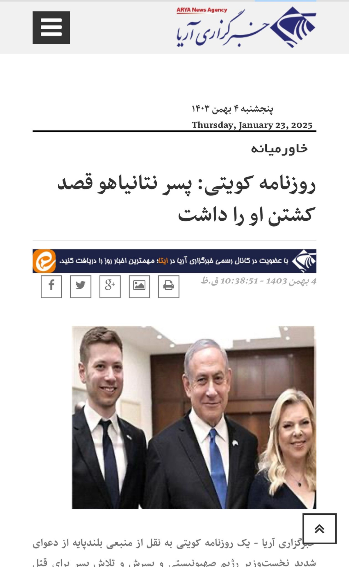 واللافت أن التقرير عن نتنياهو ونجله نُشر على الصفحة الأولى من «الجريدة» إلى جانب خبر كبير عن الانقسامات في إيران حول التفاوض مع الرئيس الأميركي دونالد ترامب، والذي بالتأكيد لم يغب عن أنظار وسائل الإعلام الإيرانية التي اهتمت بخبر نتنياهو.