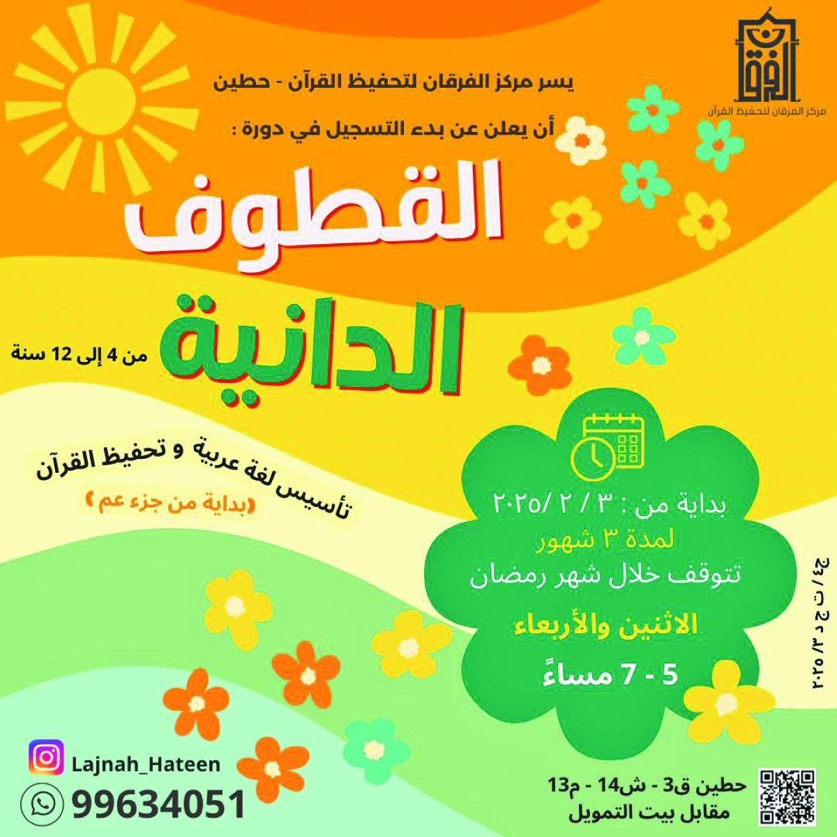 كشفت جمعية إحياء التراث الإسلامي، عن بدء التسجيل في «دورة القطوف الدانية»، للفتيات من سن 4 - 12 سنة، حيث يُشرف عليها مركز الفرقان لتحفيظ القرآن التابع للجنة النسائية في «حطين النسائية».