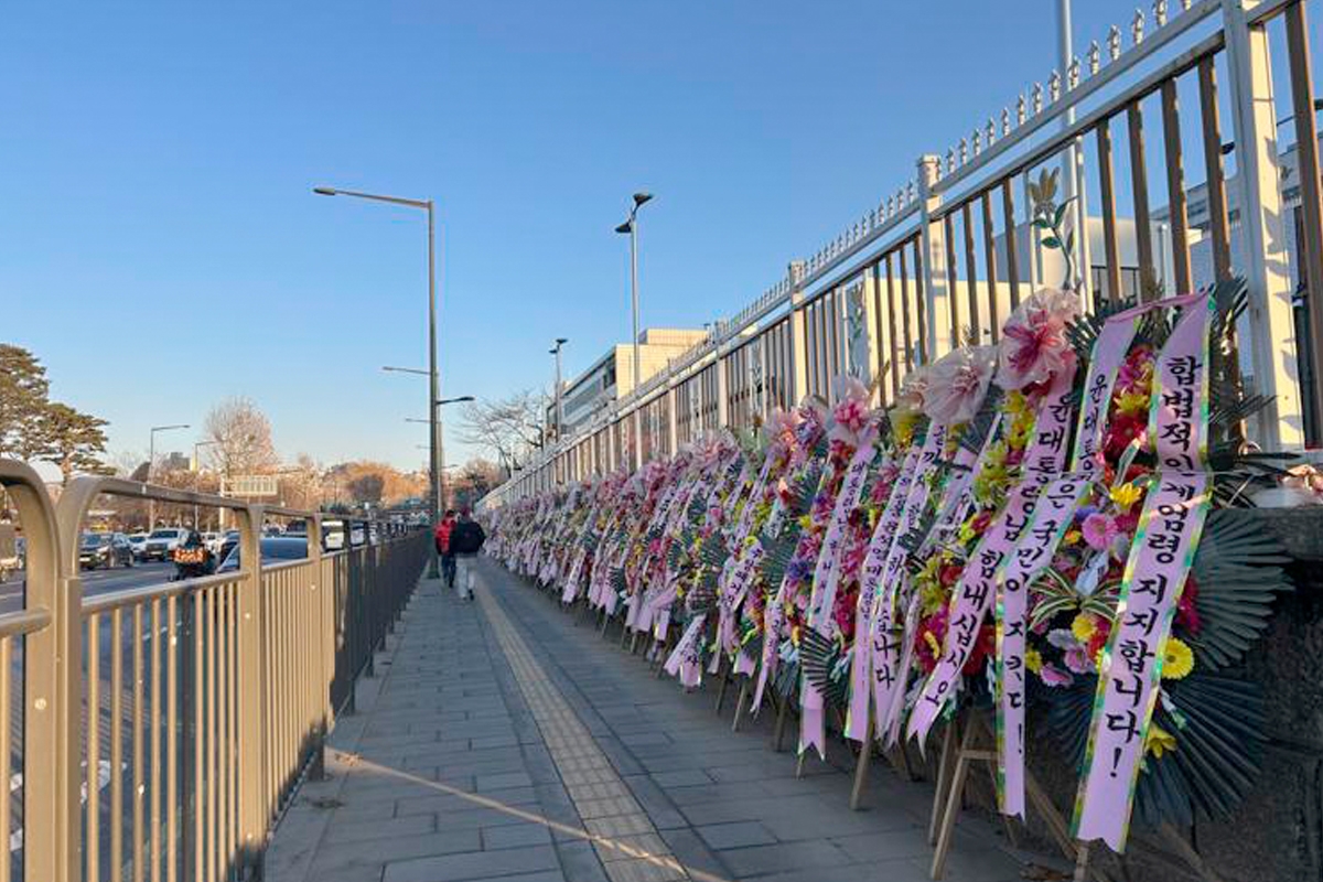 وذكرت وكالة أسوشيتد برس، أمس، أن المئات من أكاليل الزهور، الموجهة في المقام الأول إلى يون نفسه، أرسلت إلى مقر إقامته ومبان حكومية، لها صلة بإجراءات عزل يون، واستهدف بعضها مسؤولين آخرين متورطين في الجدل بشأن الأحكام العرفية. وتقدر وسائل إعلام محلية عدد أكاليل الزهور، التي تم تسليمها إلى مكاتب حكومية، بعدة آلاف.