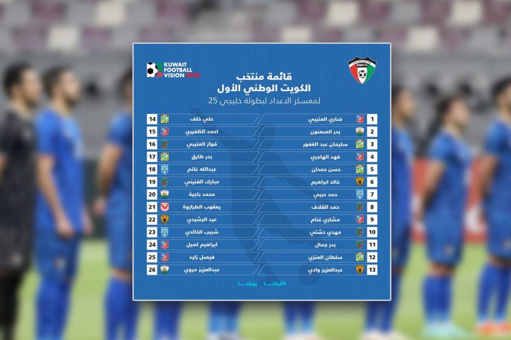 اختار الجهاز الفني لمنتخبنا الوطني لكرة القدم، 26 لاعبا لمباراة العراق الودية المقرر لها يوم 30 الجاري، في افتتاح استاد الميناء، والتي تأتي ضمن الاستعدادات ل «خليجي 25» المقرر إقامتها في البصرة خلال الفترة من 6 إلى 19 يناير المقبل، علما بأن الفريق يدشن تدريباته على الملعب الفرعي لاستاد جابر الأحمد عند الساعة 6:00 من مساء اليوم.