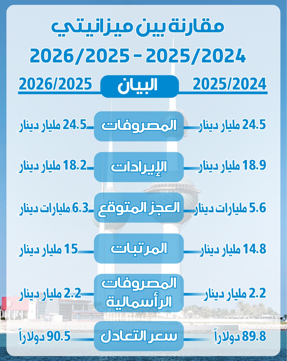 وبينما بلغت الإيرادات المتوقعة في الميزانية الجديدة 18.231 مليار دينار، قُدرت المصروفات فيها بـ 24.538 ملياراً، وسط توقعات تسجيل عجز بنحو 6.306 مليارات، لتقترب بذلك من ميزانية 2024/ 2025 المقدرة بـ 24.555 ملياراً.