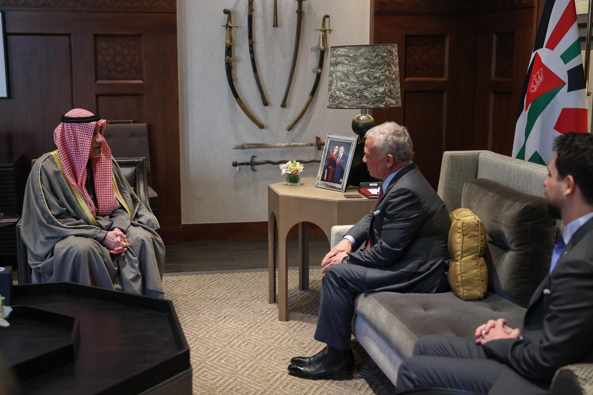 استقبل العاهل الأردني الملك عبدالله الثاني بن الحسين، بحضور ولي العهد، الأمير الحسين بن عبدالله، اليوم، النائب الأول لرئيس مجلس الوزراء وزير الدفاع وزير الداخلية، الشيخ فهد اليوسف، والوفد المرافق له، بمناسبة زيارته الرسمية للأردن.