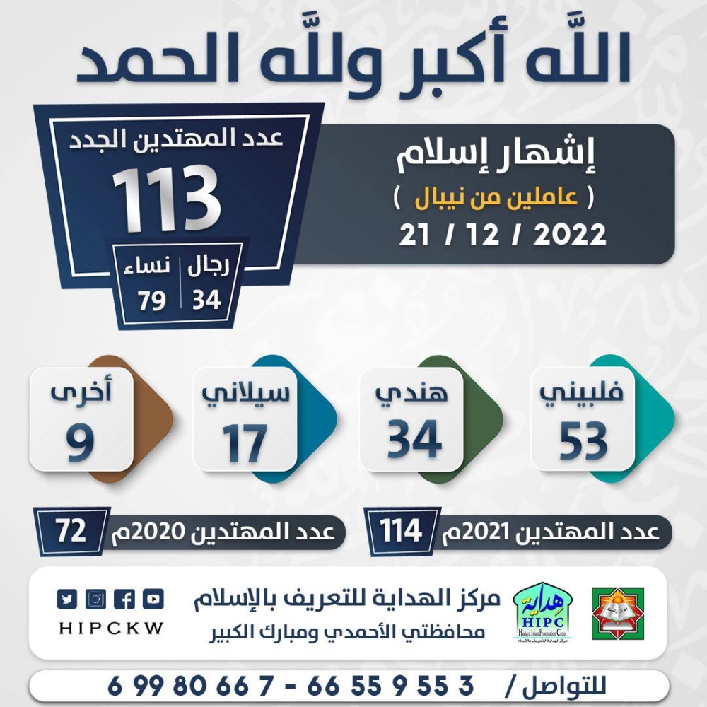 من جهة أخرى، أصدرت الجمعية تقريراً عن دعوة الجاليات داخل الكويت، أوضحت فيه أن عدد المهتدين الجدد في محافظتي الأحمدي ومبارك الكبير خلال العام الحالي بلغ 113 مهتدياً ومهتدية، وهم: 34 رجلاً، و79 امرأة.