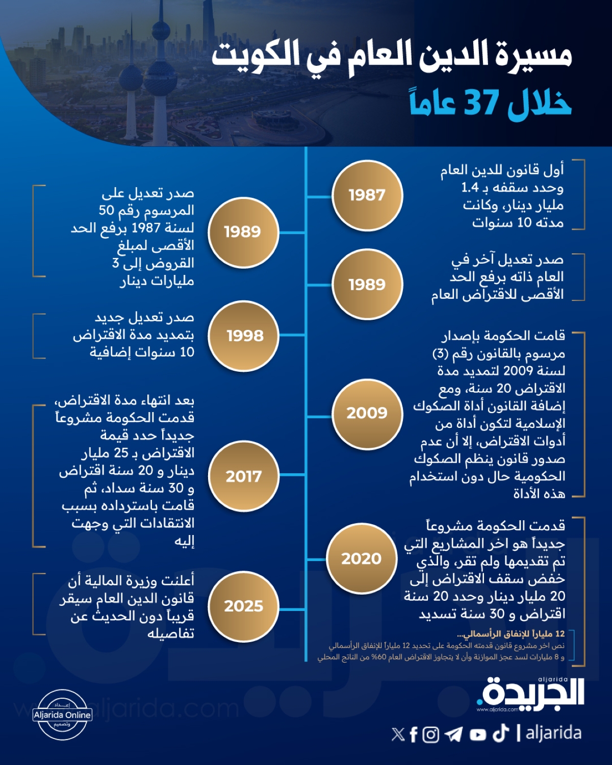 وكانت وكالة بلومبيرغ أكدت في وقت سابق، نقلاً عن مصادر مطلعة، أن «الكويت قد تقر قانوناً جديداً للدين العام يتيح لها جمع 20 مليار دينار، من إصدارات أدوات دين على مدى 50 عاماً، وأن القانون الجديد المتوقع إقراره سيسمح للبلاد ببيع أدوات دين للمرة الأولى في 8 سنوات».