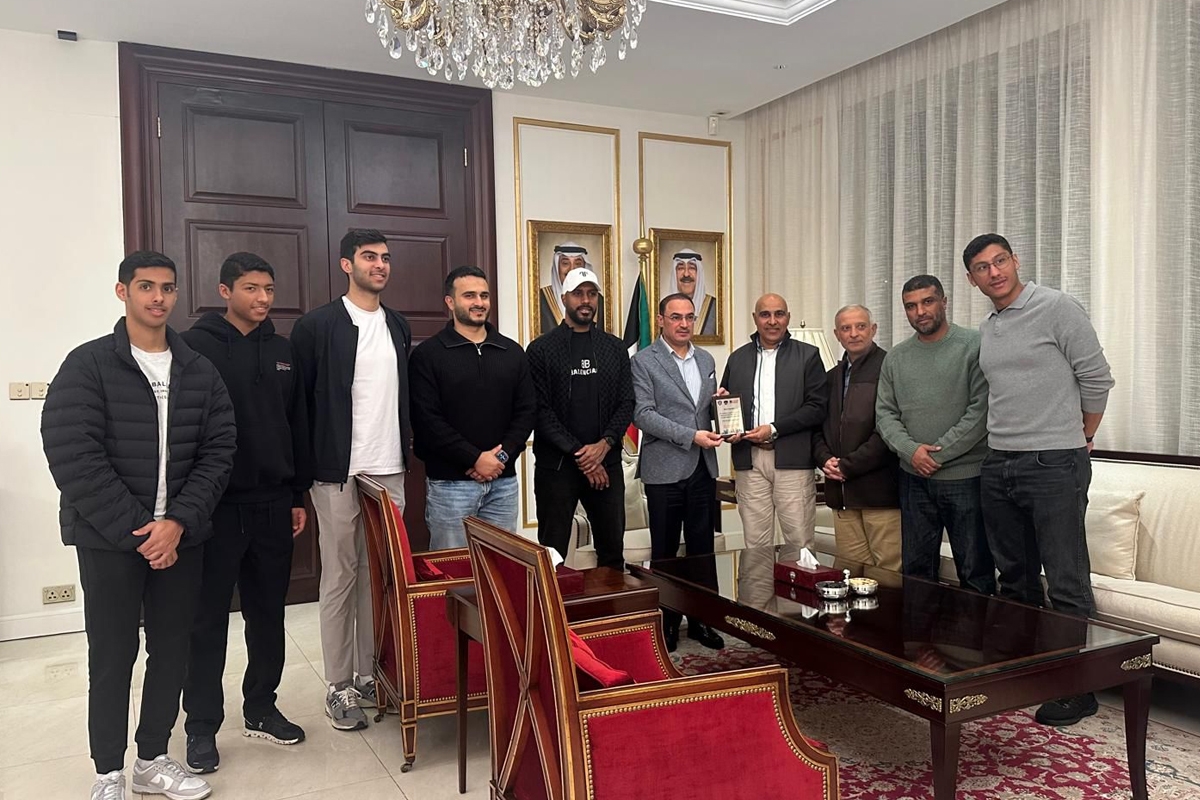 قدَّم رئيس وفد منتخب الكويت، عادل الغريب، درعاً تذكارية باسم الاتحاد الكويتي للسفير الغانم، معرباً عن شكره لحُسن الاستقبال وكرم الضيافة.