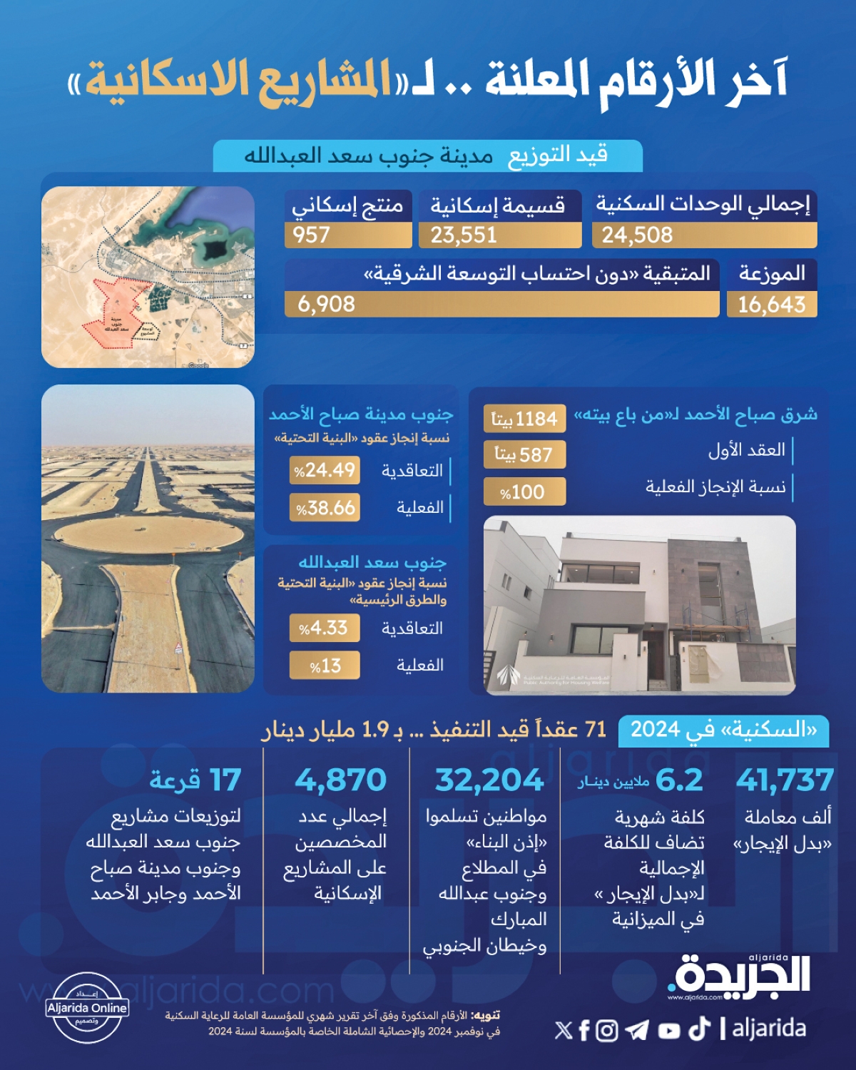 وفيما يتعلق بتوزيعات مشروع جنوب سعد العبدالله الإسكاني، ثاني أكبر مدينة سكنية بعد مدينة المطلاع، منذ توقّف توزيعات المؤسسة في يوليو 2024، تم توزيع 16.643 وحدة سكنية من أصل إجمالي 24.508 وحدات، مما يعني تبقّي 6.908 وحدات، دون احتساب التوسعة الشرقية للمشروع بمساحة 6.8 كيلومترات مربعة، والتي وافق عليها المجلس البلدي في سبتمبر 2024.