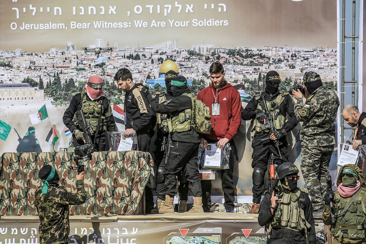 وتسلّم «الصليب الأحمر» الإسرائيلي، الروسي ساشا تروبانوف، والإسرائيلي - الأميركي ساغي ديكل حن، والإسرائيلي - الأرجنتيني يائير هورن، على منصة قرب منزل قائد «حماس» الراحل يحيى السنوار بمدينة خان يونس.