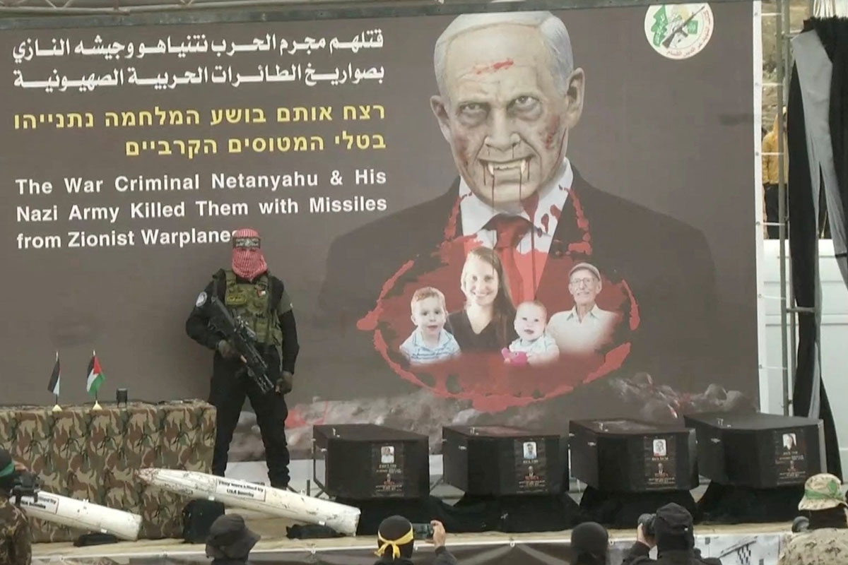 ووضعت الجثث في توابيت سود وعلى كل واحد منها صورة وبيانات صاحبه، وذلك على منصة حملت صورة تظهر رئيس وزراء الاحتلال بينامين نتيناهو كمصاص دماء. وفوق هذه الصورة، كتبت «حماس» إن المجرم نتنياهو وجيشه قتلا هؤلاء بصواريخهم النازية.