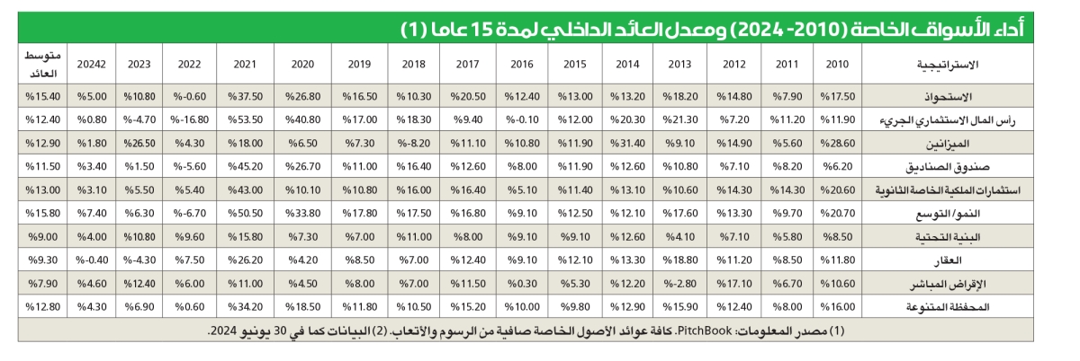ويستعرض هذا التحليل الأداء السنوي لمختلف استراتيجيات الاستثمار في الأسواق الخاصة خلال الفترة الممتدة ما بين 2010 و2024، إلى جانب متوسط العوائد السنوية على مدى 15 عاماً. وتشمل الأسواق الخاصة الاستثمارات في الأصول غير المدرجة في الأسواق المالية، مثل عمليات الاستحواذ (buyouts)، ورأس المال الاستثماري الجريء (venture capital)، والإقراض المباشر، والعقارات، والبنية التحتية.