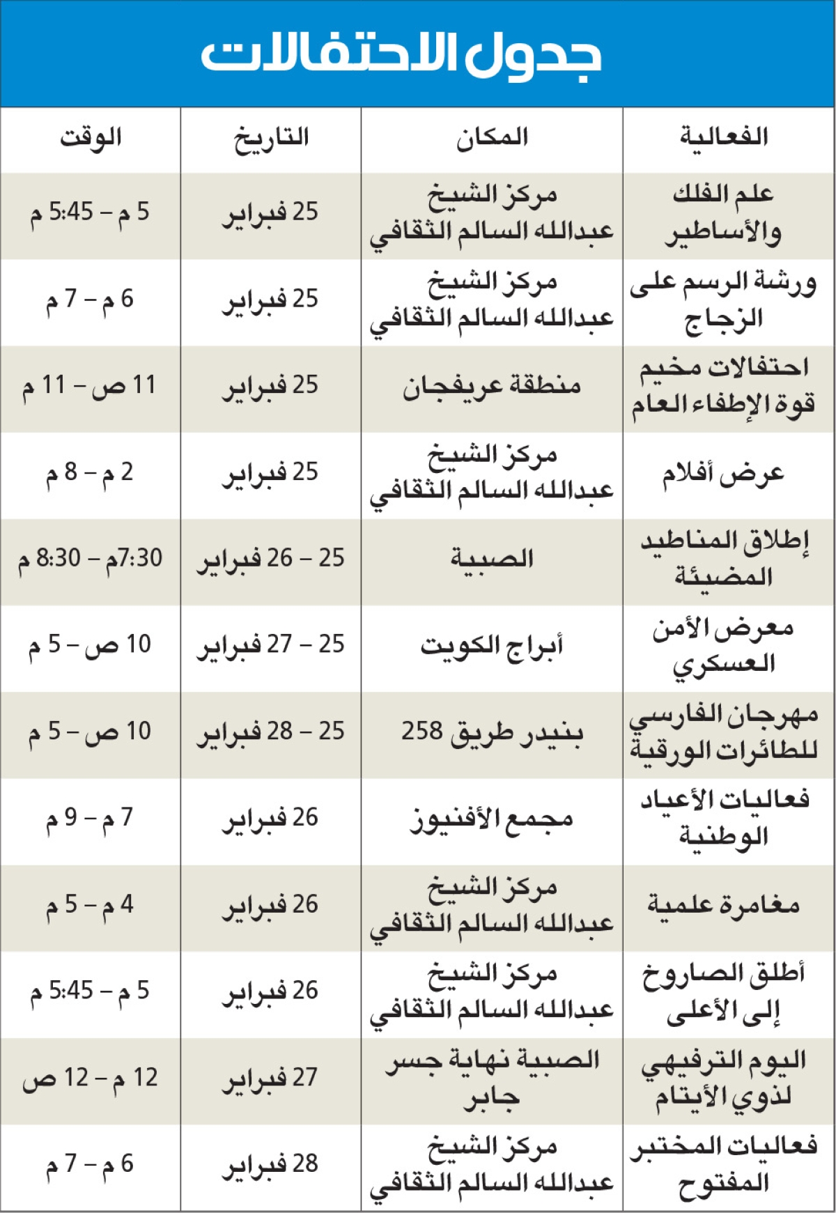 فعاليات الأعياد الوطنية التي تنظمها جهات مختلفة في الدولة، بدأت منذ مطلع فبراير ومستمرة حتى نهايته، ولم يمرّ يوم إلا وبه فعالية خاصة احتفاءً بهذه المناسبة.