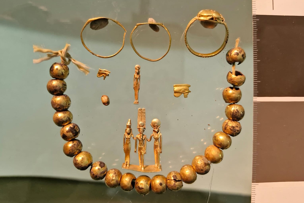 من جهته، أشار رئيس قطاع الآثار المصرية محمد عبد البديع إلى أن مجموعة الحلي تضم خواتم مصنوعة من الذهب والمعادن و«تمائم» ذهبية صغيرة من بينها تمثال ثلاثي للآلهة المصرية القديمة «آمون» و«موت» و«خونسو» بالإضافة إلى «بروش» معدني و«تمائم تمثل الآلهة في أشكال حيوانية» وعدد كبير من «الخرز» بعضها مطلي بالذهب.