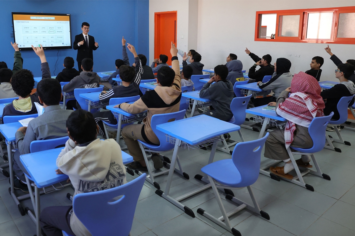 ويقول في فصله الذي يضم 30 تلميذاً «قد يأتي مزيد من الشركات الصينية إلى السعودية. الطلاب في المدارس الأخري يعرفون الإنكليزية، أنا أعرف العربية والإنكليزية والصينية، وهذه ميزة كبيرة لي في المستقبل».