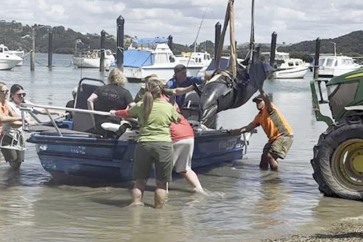 ولكن إعادة المخلوق الضخم إلى البحر لم يكن خياراً للثلاثي بسبب حجمه، لذا أخطرَ الرجال وكالة الحفاظ على البيئة النيوزيلندية وجرى توجيههم إلى منزلق للقوارب على بعد ساعة منهم، حيث انتظر العمال لمساعدة الدولفين.