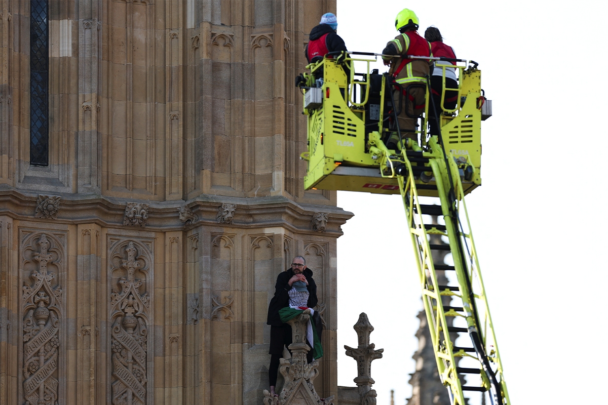 وقال محاميه والمدعون العامون لمحكمة وستمنستر في لندن إن دانيال داي (29 عاما) ارتقى 25 متراً من المبنى المعروف رسمياً باسم برج إليزابيث، نحو الساعة 7:20 صباح يوم السبت، وهو يمسك بعلم فلسطيني، وظل هناك 16 ساعة حتى وافق على النزول.