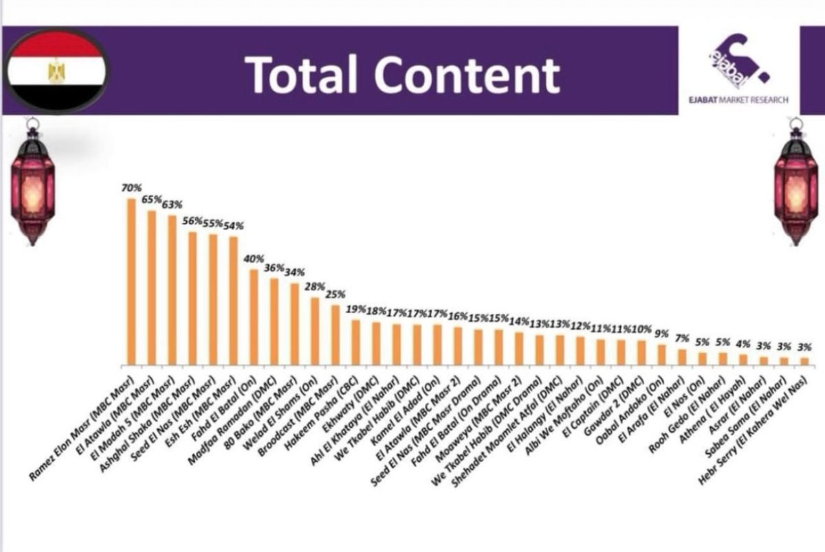 ورغم أن هناك بعض القياسات المنطقية والتي تتوافق فيها التوقعات أو الآراء أو التقييم الفني للعمل مع نتائج البحث، إلا أن المفاجئات أكثر إبهاراً، فقد جاء مسلسل المداح في نسخته المكررة للمرة الخامسة في المركز الثاني على مستوى الدراما عقب العتاولة وبنسبة مشاهدة بلغت 63%، ليليه في الترتيب، مسلسل أشغال شقة جداً والذي نال الاستحسان على المستويين الفني والجماهيري، لنعود بعده إلى قائمة المفاجآت، بمسلسل سيد الناس، بنسبة 55% رغم مسواه الفني الرديء ورغم ما ناله وصنّاعه من هجوم وسخرية على صفحات التواصل الاجتماعي. ولنفس مخرج المسلسل يستحوذ محمد سامي مع زوجته النجمة مي عمر على المركز التالي وبنسبة 54% بمسلسل إش إش.
