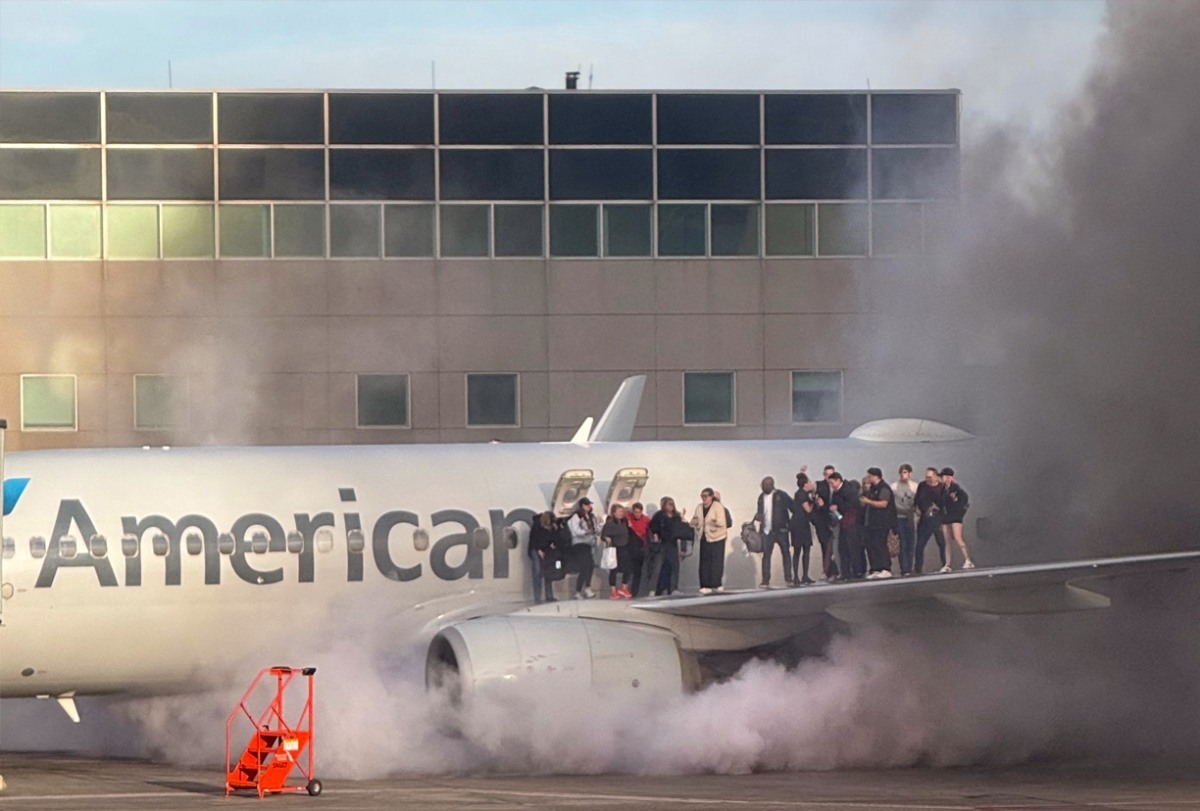 وأظهرت بعض الصور الطائرة وقد غلفها الدخان وركاباً يقفون على أحد جناحيها في انتظار المساعدة.
