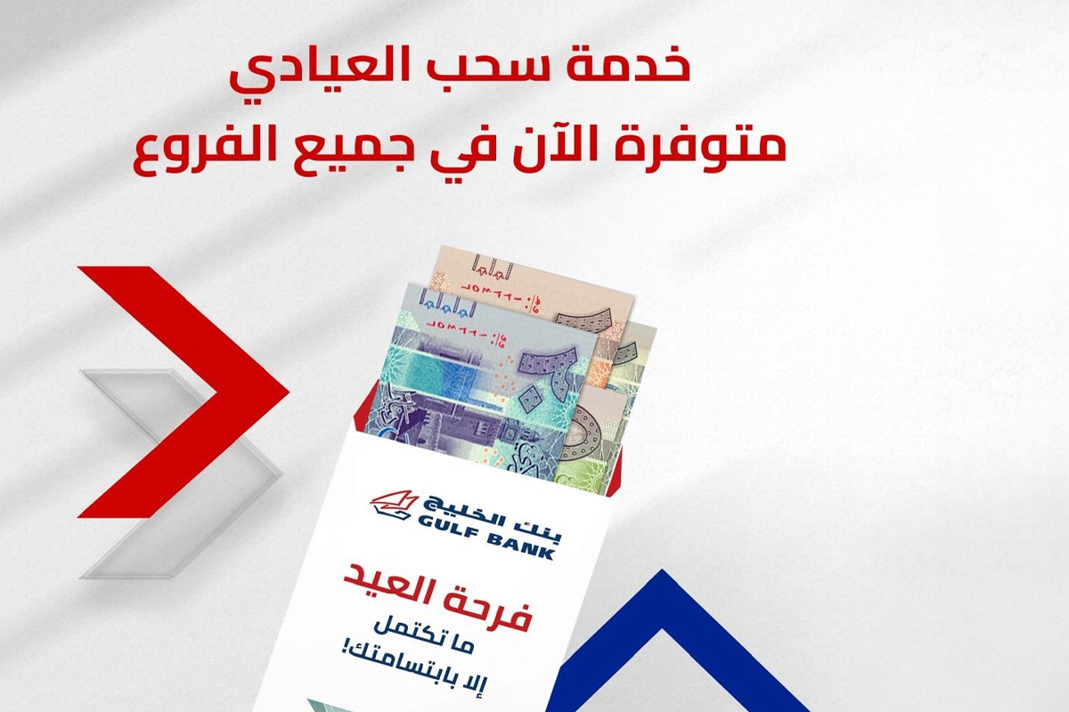في إطار حرصه على مشاركة العملاء والجمهور فرحة عيد الفطر المبارك، وتلبية لاحتياجات العملاء، يوفر بنك الخليج خدمة العيادي في جميع فروع البنك (باستثناء فرع المطار) إلى نهاية شهر رمضان، وعبر أجهزة الصراف الآلي التفاعلي ITM.