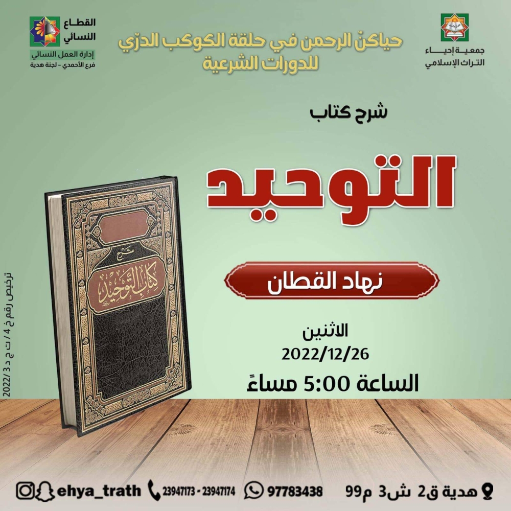 وقالت الجمعية، في بيان، أمس، إن القطاع النسائي نظم دورة في شرح كتاب «التوحيد» حاضرت فيها نهاد القطان بمنطقة هدية.