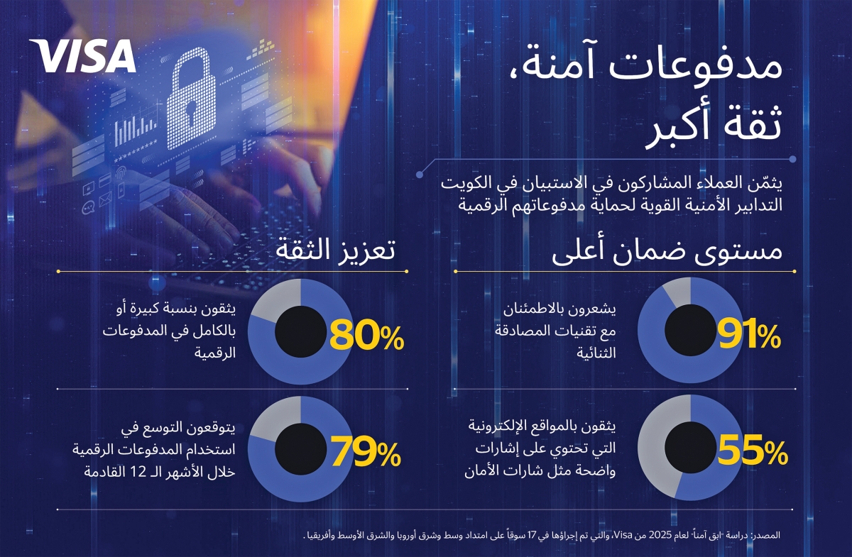 أصدرت شركة Visa، دراسة حديثة كشفت فيها عن ارتفاع وعي المستهلكين وزيادة الإجراءات الاحترازية التي يتخذونها لإتمام المدفوعات الرقمية في الكويت. واستطلعت النسخة السنوية التاسعة من دراسة «ابقَ آمناً» آراء 5.800 شخص بالغ، في 17 سوقاً موزعة بمنطقة وسط أوروبا والشرق الأوسط وإفريقيا، وأشارت إلى أن 94 بالمئة من العملاء في الكويت يتخذون مزيداً من الإجراءات الاحترازية لضمان أمن معاملاتهم الرقمية، مما يسلط الضوء على ارتفاع الوعي تماشياً مع الزخم الكبير الذي يكتسبه القطاع.