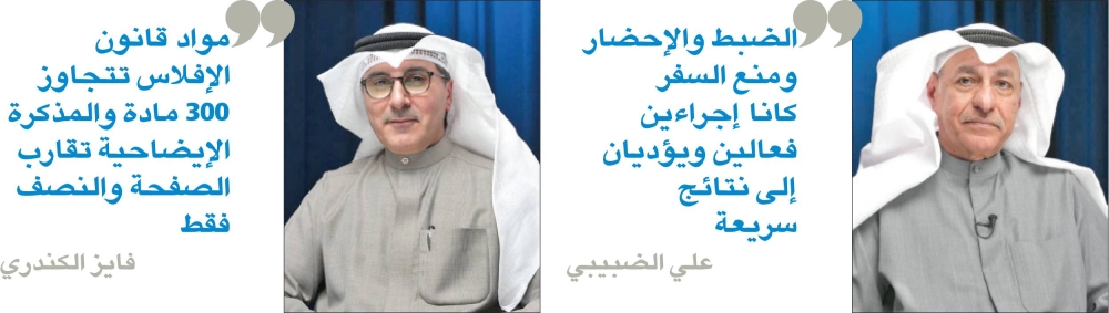 واستطرد الكندري: وهنا أحب أن أشير إلى أن «التجارة» ليست معنية بهذا القانون فالوزارة هي حزمة حكومية وليس لك أن تتحدث عن فلسفة تشريع، لك أن تتكلم عن فلسفة تشريع في المذكرة الإيضاحية فكما غاب عن هذا القانون المهم الفلسفة التشريعية لكل المواد التي تم النص عليها ولكل جديد جاء في قانون الإفلاس كما أن العنوان أيضاً خطأ قانون التسوية الوقائية والتدابير الاحترازية ومن ثم الإفلاس، فالعنوان خاطئ والمذكرة الايضاحية شبه معدومة، وهذا القانون غابت عنه الفلسفة ولا توجد إجابات حول لماذا تم إلغاء اجراء الضبط والاحضار.