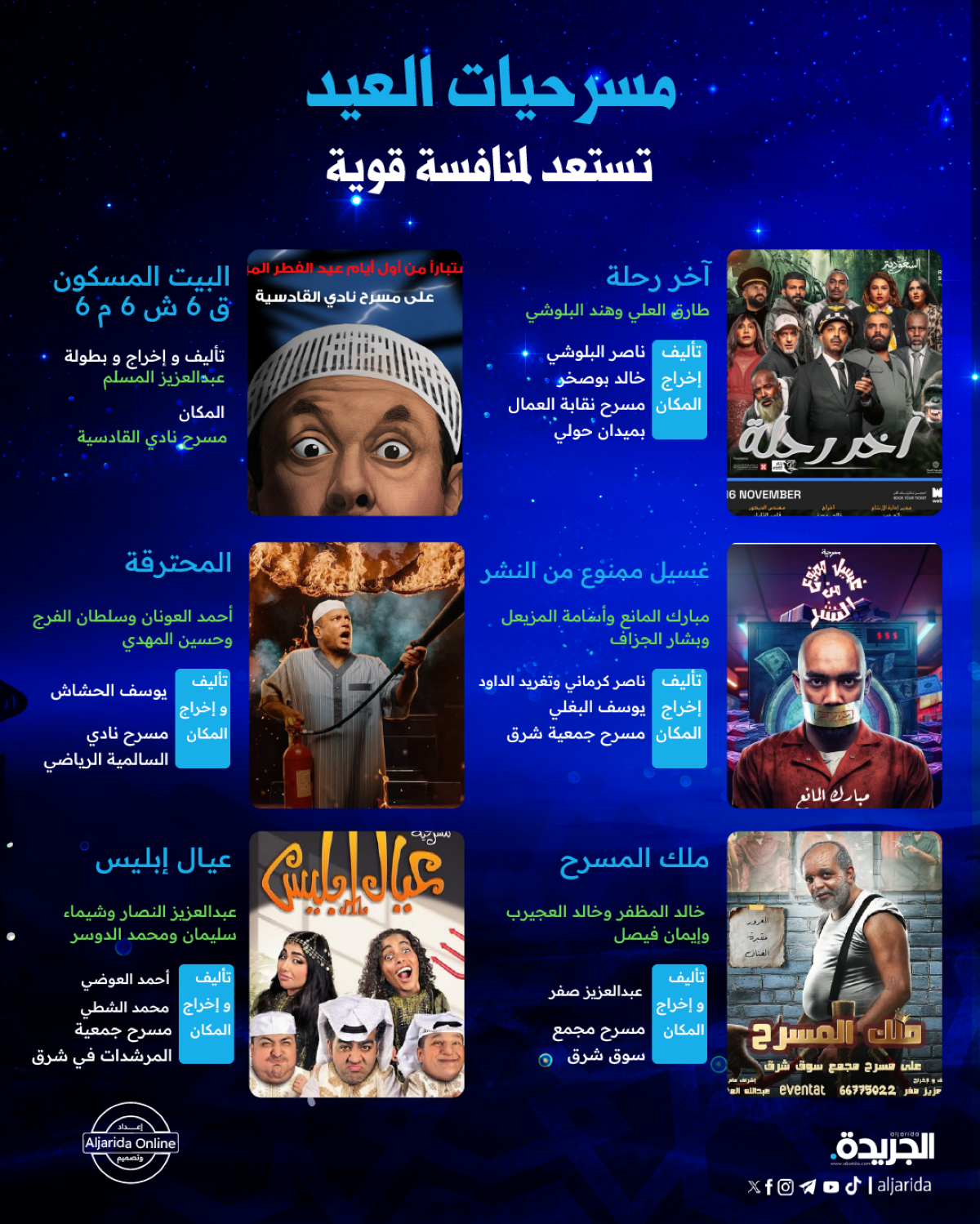 ومن المسرحيات المرتقبة في موسم عيد الفطر المقبل مسرحية «آخر رحلة» للفنانين طارق العلي وهند البلوشي، تأليف ناصر البلوشي، وإخراج خالد بوصخر، على مسرح نقابة العمال بميدان حولي، وهي المسرحية التي تم عرضها العام الماضي، حيث سيتم تقديم نسخة تضم وجوهاً جديدة، وتشهد تطورات مختلفة.