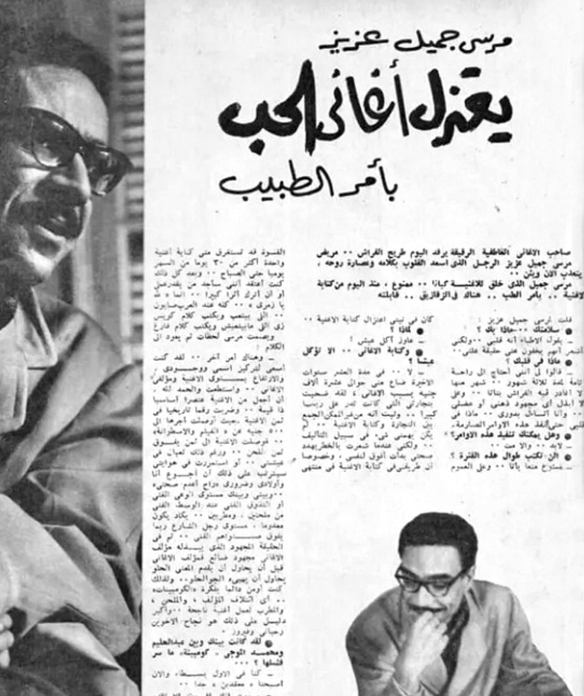 وفي ذلك الوقت، نشرت مجلة «الكواكب» الفنية، تفاصيل تلك الأزمة، وظهور الشاعر مرسي جميل عزيز في أروقة الجمعية، يخفي وجهه تحت نظارته السوداء التي اشتهر بها، ويطلق لحيته، وكان قد تعافى من مرض أصابه قبل ثلاثة أشهر، ومنعه الأطباء من الحركة والكلام والتأليف، للحفاظ على سلامة قلبه، ونشرت الصحف هذا الخبر تحت عنوان «مرسي جميل عزيز يعتزل أغاني الحب بأمر الطبيب».