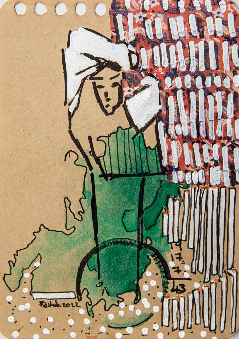تلتقط الفلاح أحد المشاهد القابعة في ذاكرتها البعيدة لرجلٍ يسكن في شارع جدتها كان دائماً يذكّرها بالجبنة القديمة، وهي أكلة مصرية معروفة منذ زمن الفراعنة، حتى أنها أطلقت على ذلك الرجل هذا الاسم المثير للدهشة: «رجل الجبنة القديمة»، لتستعيد ذلك المشهد بعد كل تلك السنوات وترويه مجدداً لوالدها الراحل في مجموعة من القصاصات الورقية والأعمال الفنية التي تمتزج معاً عبر رحلة تحاول فيها الفنانة أن تجد سبيلاً للتصالح مع ذاتها ولتقبل الواقع بصدماته وبمشاعر الفقد التي لا تجد متنفساً لها إلا من خلال التعبير بالفن، ولذا تبدو لوحاتها مثل تدوينات يومية مكثفة لا تخضع لقيود من أي نوع إلا أن تعبّر عما تشعر به ليغادر داخلها المزدحم إلى العالم الرحب في الخارج علها تشعر بالراحة.