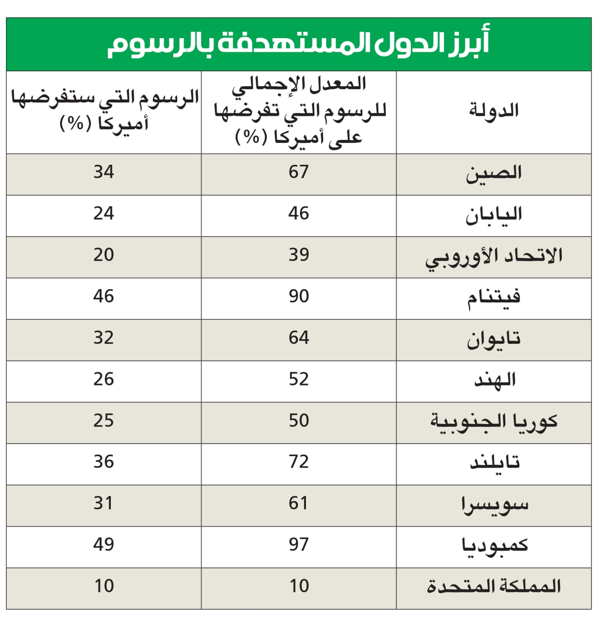 وأكد ترامب في تصريحاته، أن الرسوم ستشمل فرض نسبة 34% على الصين، و24% على اليابان، و31% على سويسرا، و46% على فيتنام، و32% على تايوان، و26% على الهند، و50% على ليسوتو، بينما سيفرض الاتحاد الأوروبي رسوماً بنسبة 20%. وشدد على أن أقل نسبة للرسوم الجمركية ستكون 10%، والتي ستكون من نصيب بريطانيا.