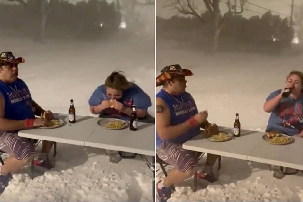 لم يدَع اثنان من مشجعي فريق كرة القدم الأميركية «بوفالو بيلز» الظروف الجوية تعوق وجبتهما المسائية المفضلة، حيث تناولا العشاء خارج منزلهما في ديبي، بنيويورك، وسط العاصفة الثلجية.