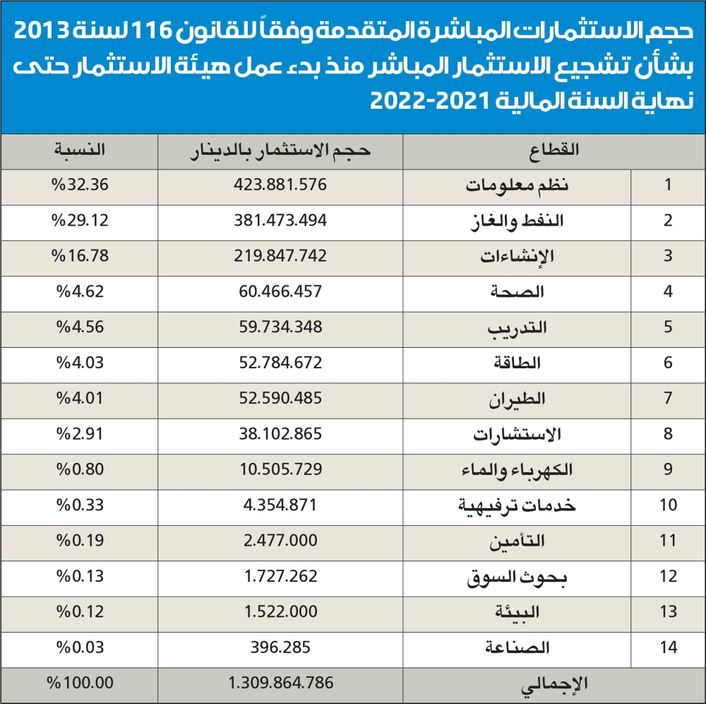 الى ذلك، وفي ردها على سؤال للنائب أسامة الزيد، افادت هيئة تشجيع الاستثمار المباشر، بأن حجم الاستثمارات المباشرة والموافق عليها وفق قانون الهيئة رقم 116 لسنة 2013 منذ البدء في تلقي الطلبات بداية 2015 حتى مارس 2022 بلغ 1.309.864.786 دينارا.وعن أثر عدم الافصاح عن البيانات على جذب الاستثمارات الاجنبية للكويت، قالت الهيئة: «نود الافادة بأنه وفقا للمادة 23 من القانون بشأن سرية المعلومات يتمتع المستثمر بمبادئ سرية المعلومات الفنية والاقتصادية والمالية المتعلقة باستثماره، وتقدم الهيئة التقرير السنوي للوزير المختص متضمنا احصائية بأنشطتها والمشاريع المتقدمة للهيئة، وذلك وفقا للمادة 31 من القانون، والتي تنص على أن يقدم الوزير المختص لمجلس الأمة نسخة من التقرير السنوي الصادر عن الهيئة، وصورة من الاحصائية الخاصة بنشاط الهيئة ومشروعاتها، وذلك خلال 30 يوما من تاريخ عرضها على مجلس الوزراء.