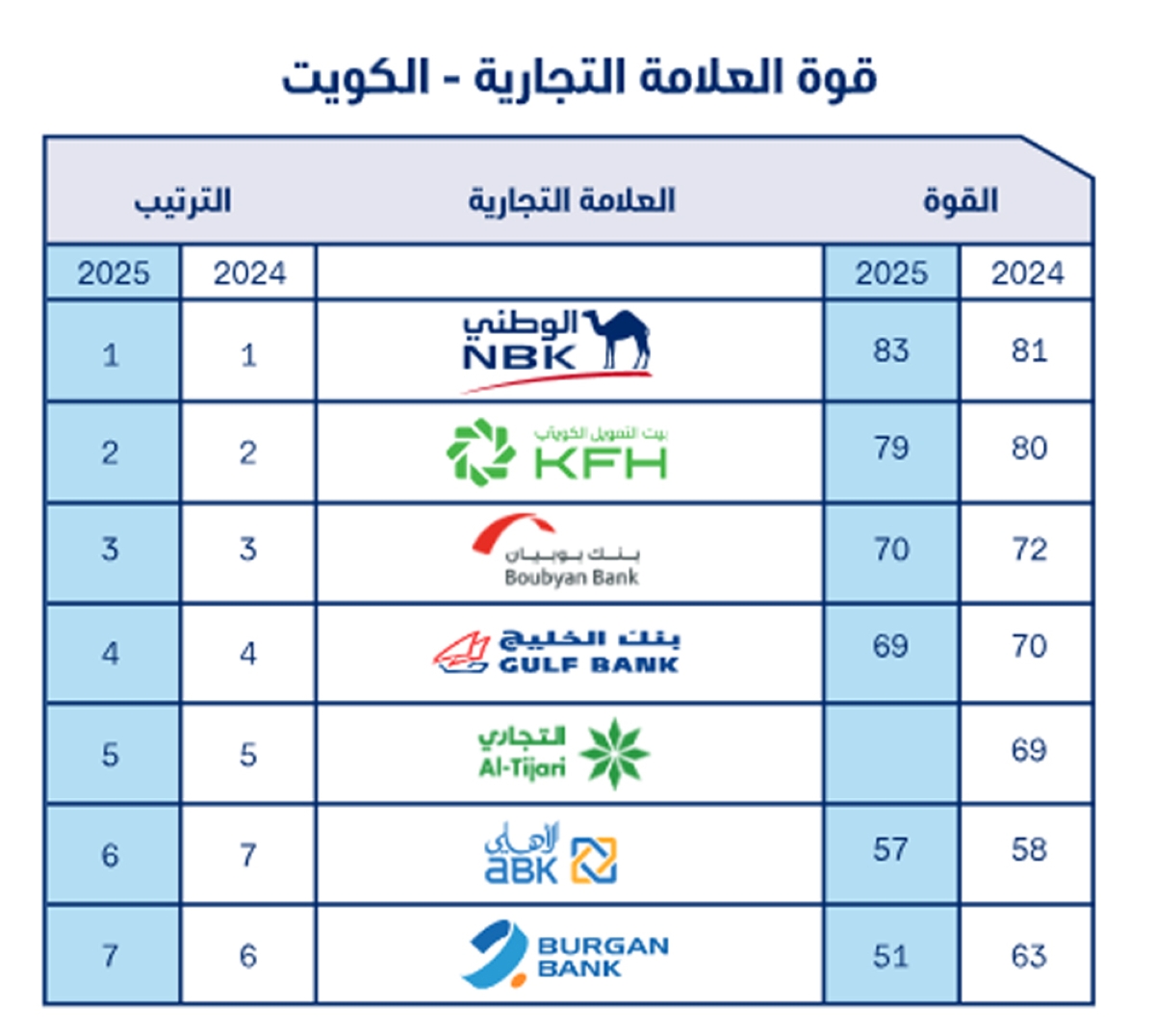 وأظهر تقرير «براند فاينانس» لهذا العام نجاح البنك في توسعة الفارق مع منافسيه من البنوك في الكويت من حيث قيمة العلامة التجارية وقوتها، إذ بلغت قيمتها لبنك الكويت الوطني 1.738 مليار دولار في 2025، محققة قفزة بنسبة 22 في المئة مقارنة بقيمتها في 2024 البالغة 1.428 مليار دولار، لتحتل بذلك المرتبة العاشرة من حيث قيمة العلامة التجارية على مستوى البنوك في الشرق الأوسط، أما قوة العلامة التجارية للبنك على مؤشر «براند فاينانس»، فتحسنت لتصل إلى 83.3 نقطة مقارنة بـ 81.2 نقطة في 2024، ليحتل «الوطني» بذلك المرتبة الأولى على مستوى الكويت من حيث قوة العلامة التجارية للسنة الـ14 على التوالي، والمركز الثالث على مستوى العلامات التجارية المصرفية الأقوى في المنطقة.