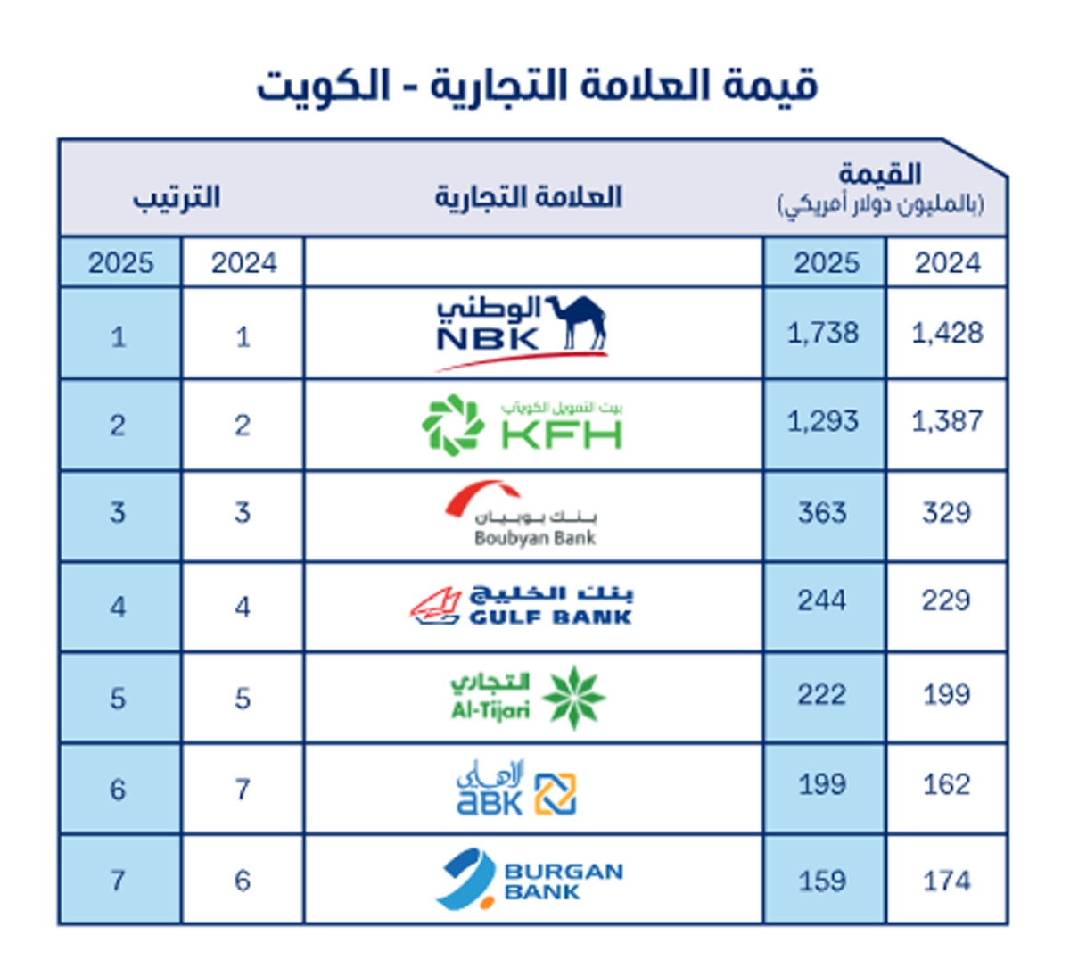 تصدرت العلامة التجارية لبنك الكويت الوطني العلامات التجارية المصرفية الأعلى قيمة والأقوى بين جميع البنوك في الكويت للعام 2025، وفقاً للتقرير السنوي لشركة «براند فاينانس» العالمية لتقييم العلامات التجارية.