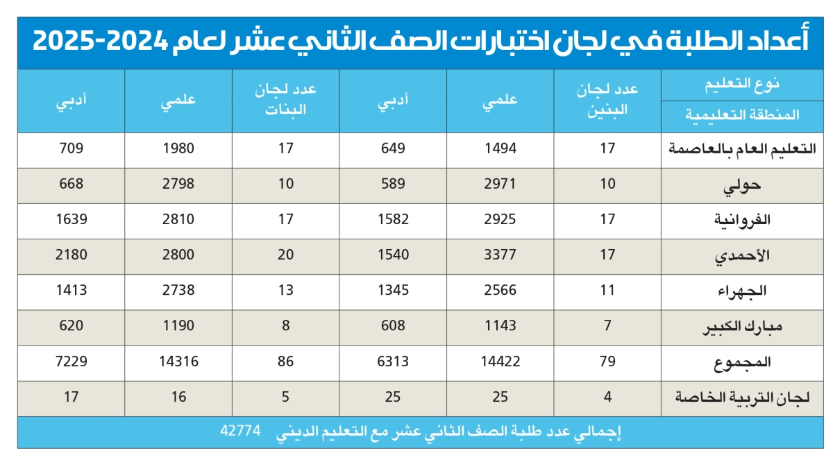 وأكدت مصادر تربوية رفيعة لـ «الجريدة» أن الوزارة اتخذت قراراً بعدم تدوير لجان اختبارات الصف الثاني عشر، موضحة أن إجمالي عدد اللجان 176 لجنة بواقع 79 لجنة للمدارس الثانوية - بنين، و86 للمدارس الثانوية - بنات، و9 لجان لمدارس التربية الخاصة، و4 لجان للتعليم الديني.
