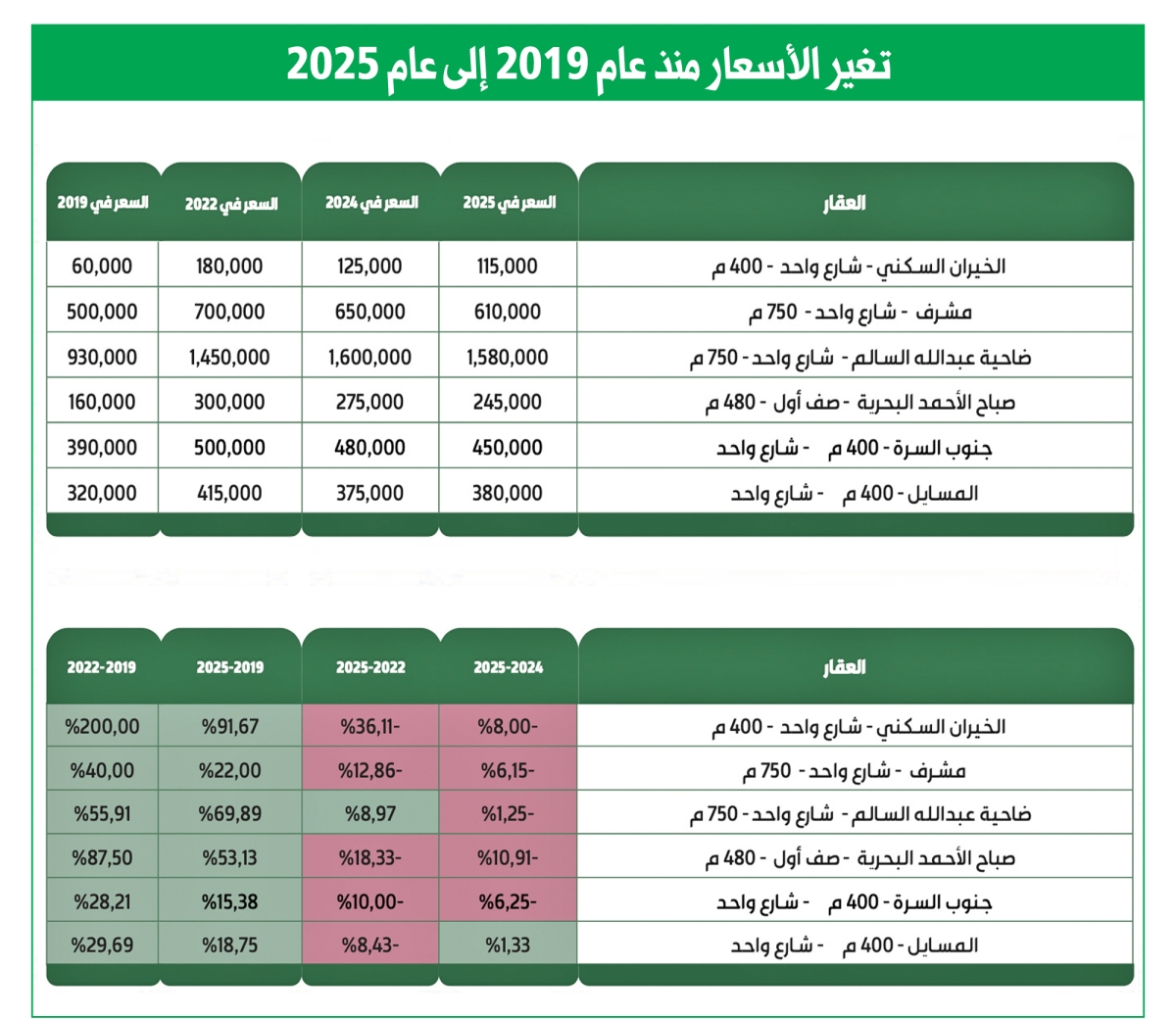 وعند مقارنة الأسعار الحالية بأسعار ما قبل جائحة كورونا في عام 2019، يتضح أن الأسعار لا تزال مرتفعة بشكل كبير، حيث بلغت نسبة الارتفاع في الخيران السكنية 92%، تلتها ضاحية عبدالله السالم بنسبة 70%، فيما كانت منطقة المسايل ثاني أقل المناطق ارتفاعاً بنسبة 18%، مما يدعم فرضية اقترابها من القيمة الحقيقية وفق المعدلات الطبيعية لنمو سعر العقار.