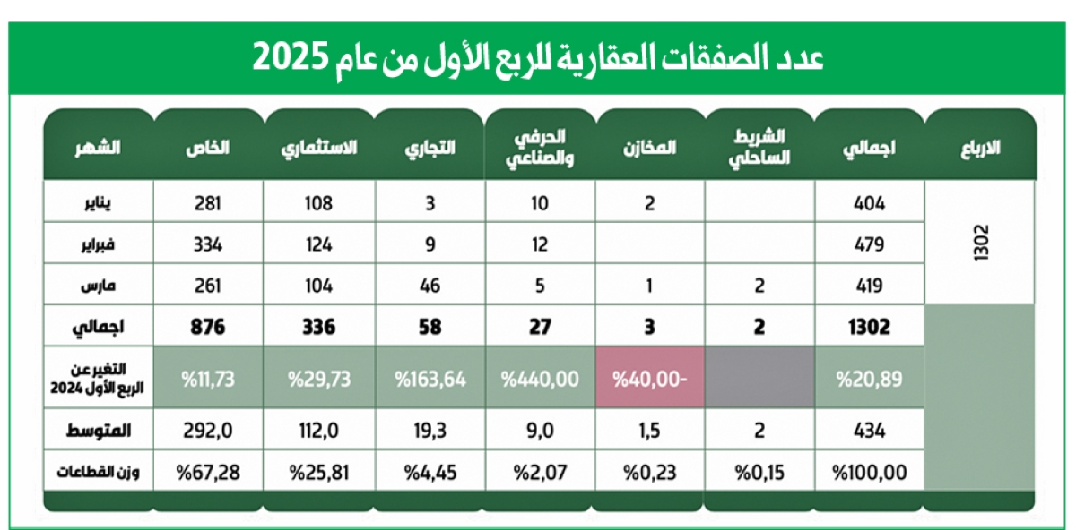 حقق القطاع الحرفي والصناعي أعلى نسب النمو، إذ قفزت قيمة التداولات بنسبة 583.8%، لتصل إلى 50.257 مليون دينار مقارنة بـ7.35 ملايين. كذلك، ارتفع عدد الصفقات بنسبة 440% ليبلغ 27 صفقة مقارنة بـ5 صفقات فقط في الربع الأول من عام 2024، وهذا النمو الكبير يعكس تحولات في توجهات الاستثمار نحو تنويع القطاعات العقارية وعدم التركيز على القطاع السكني فقط.